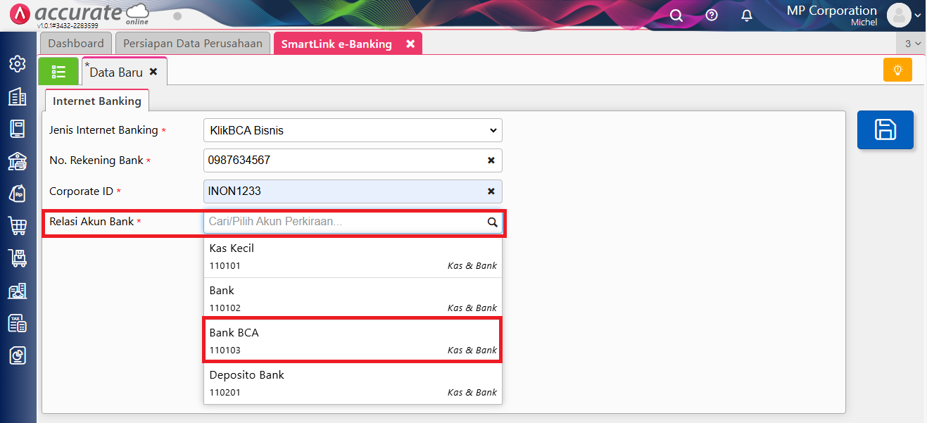 3. Pada informasi relasi Akun Bank, pilih nama akun Bank pada AOL yang mewakili nilai dari internet banking yang didaftarkan tersebut.