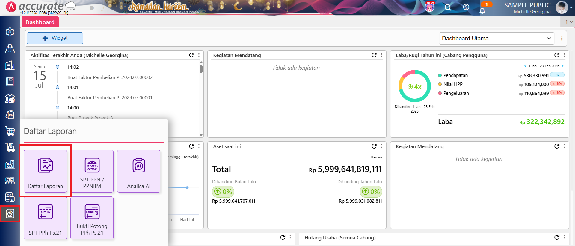 Pada Accurate Online, apabila Anda ingin menganalisa laporan keuangan dengan lebih mudah, maka Anda bisa menggunakan Ailita (AI Akuntansi) yang sudah tersedia pada menu laporan. Berikut langkah-langkah untuk menganalisa laporan keuangan menggunakan Ailita (AI Akuntansi) di Accurate Online: