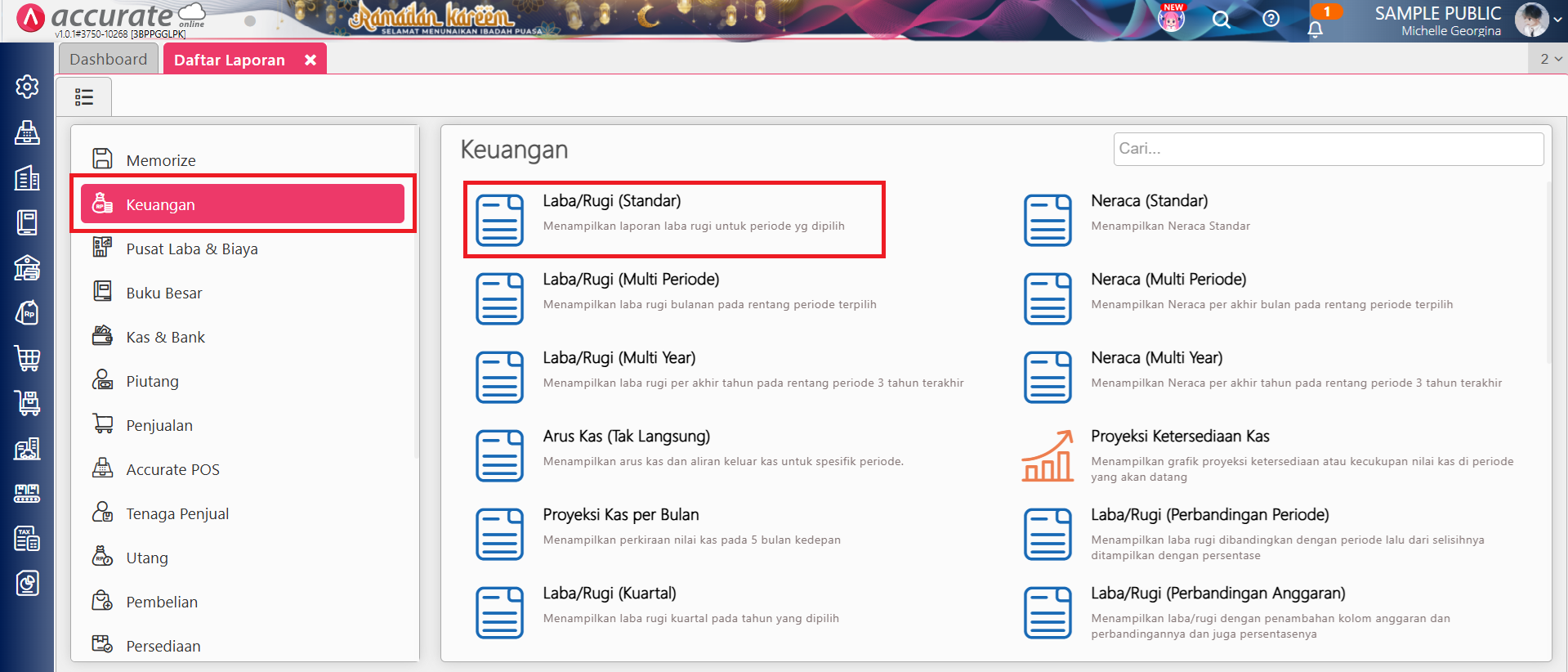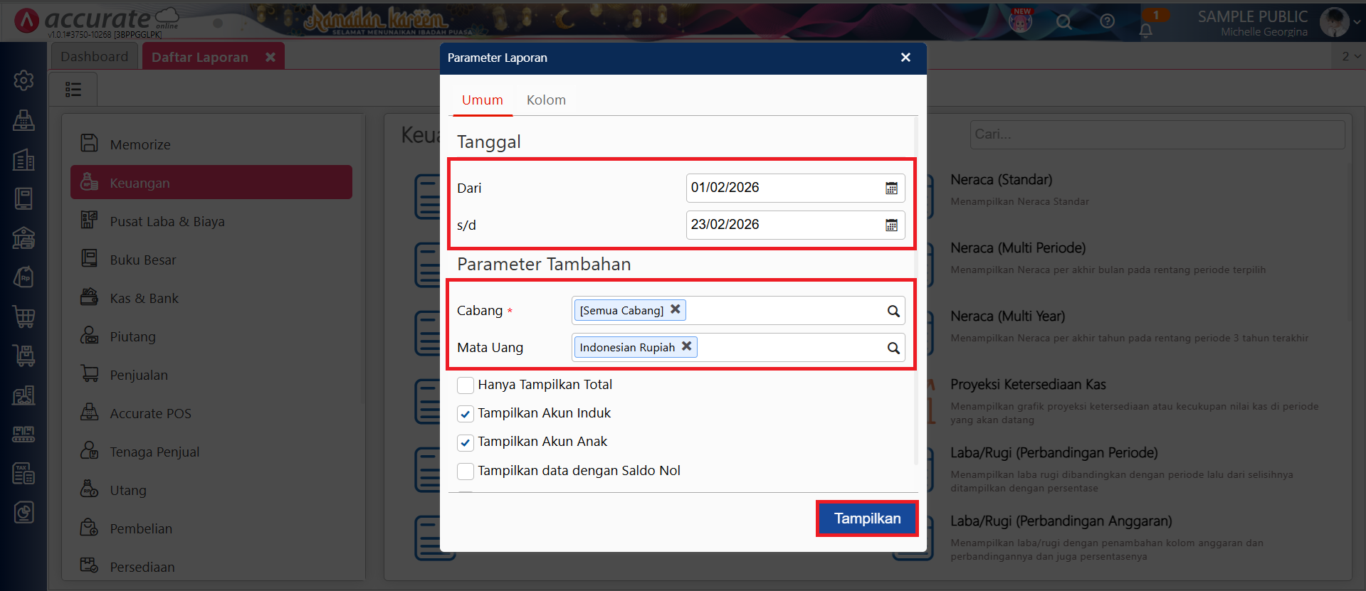 - Pilih Laporan yang ingin dianalisa, misal laporan Laba/Rugi (Standar). Lalu, atur parameter laporan seperti Tanggal, Cabang, dan Mata Uang sesuai kebutuhan, lalu klik Tampilkan.