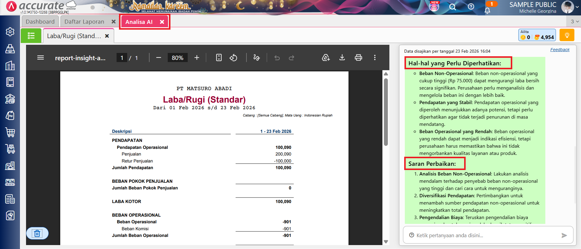 - Selanjutnya, untuk menganalisa laporan Laba/Rugi (Standar) nya, bisa dengan cara klik tombol Analisa Pintar oleh Ailita.