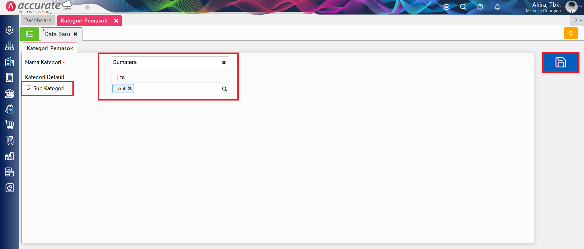 - Selanjutnya membuat Sub Kategori Pemasok, dengan nama Sumatera, lalu centang pada bagian Sub Kategori, kemudian pada field di sampingnya pilih Lokal sebagai Induk Kategori, lalu klik Simpan.