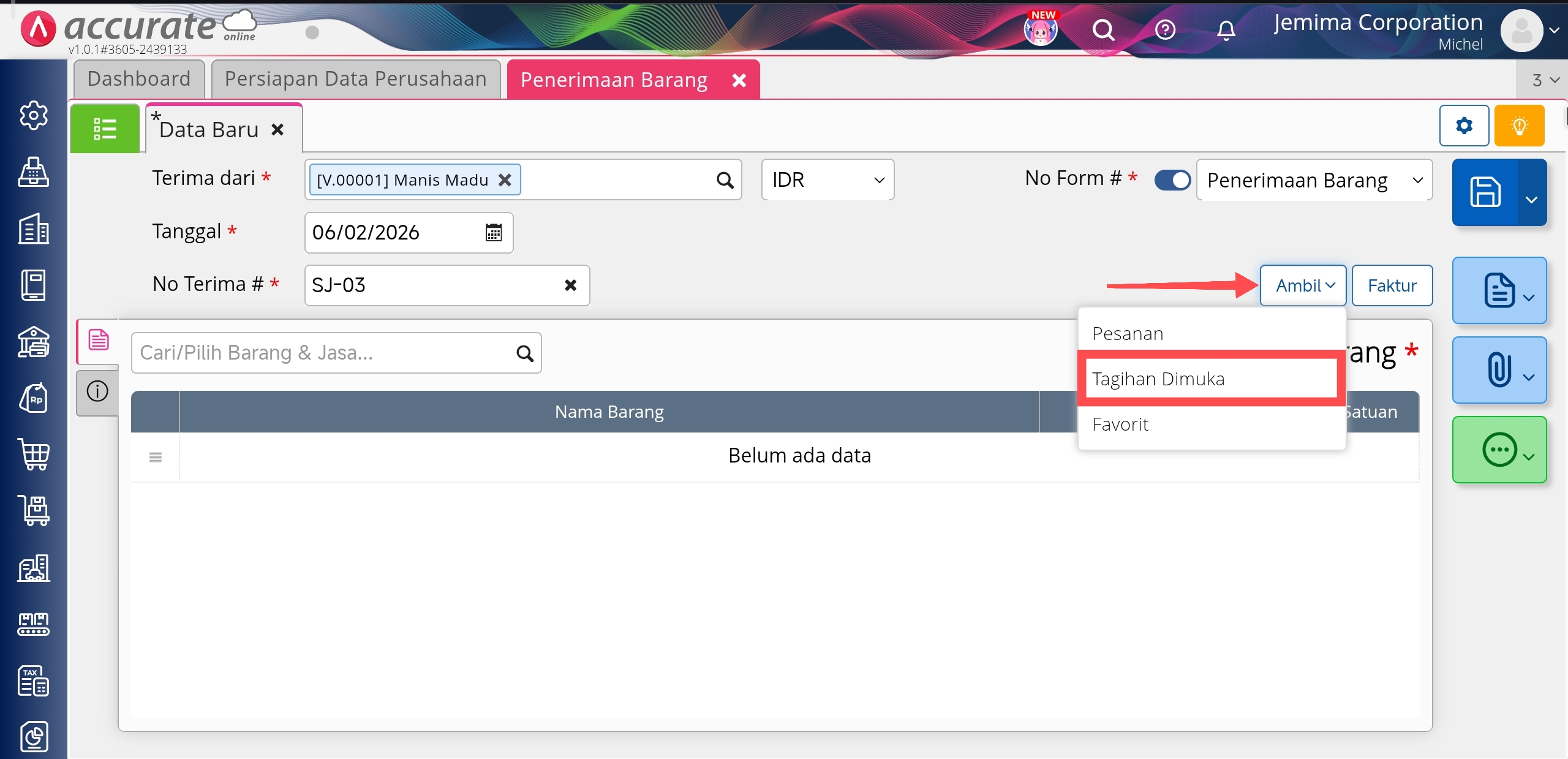 - Silahkan lengkapi informasi Nama Pemasok, Tanggal, No. Terima, lalu klik tombol Ambil | Tagihan Dimuka.