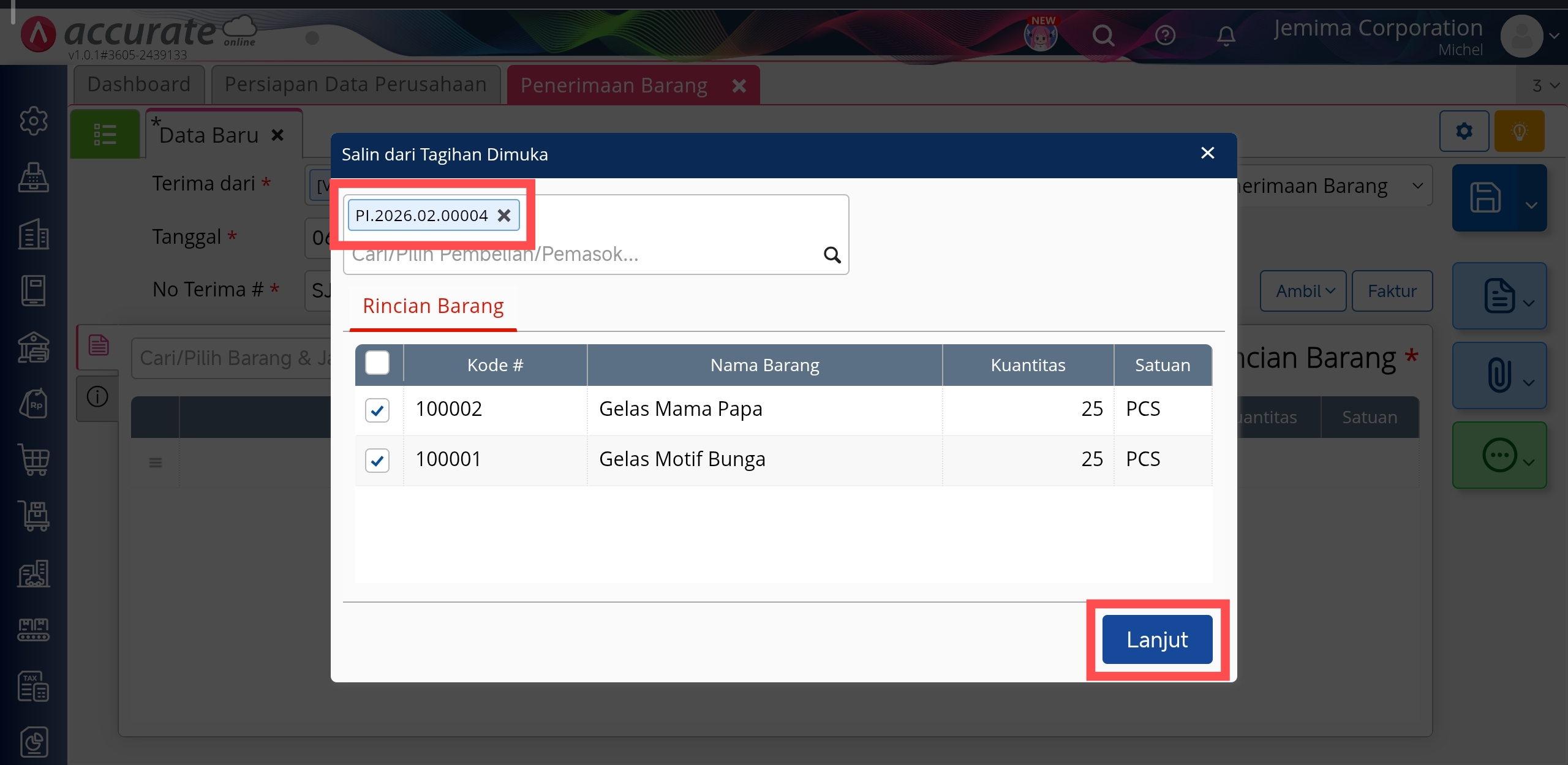 - Pilih transaksi Tagihan Dimuka yang akan dilakukan penerimaan barang, lalu klik Lanjut.