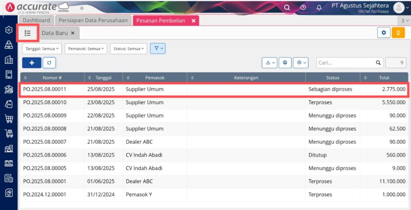 2. Klik Daftar Pesanan Pembelian, lalu cari nomor pesanan pembelian yang akan dibatalkan, bisa dengan dengan cara mengetik pada bagian Search atau bisa juga menscroll tampilan pada layar daftar pesanan pembelian.