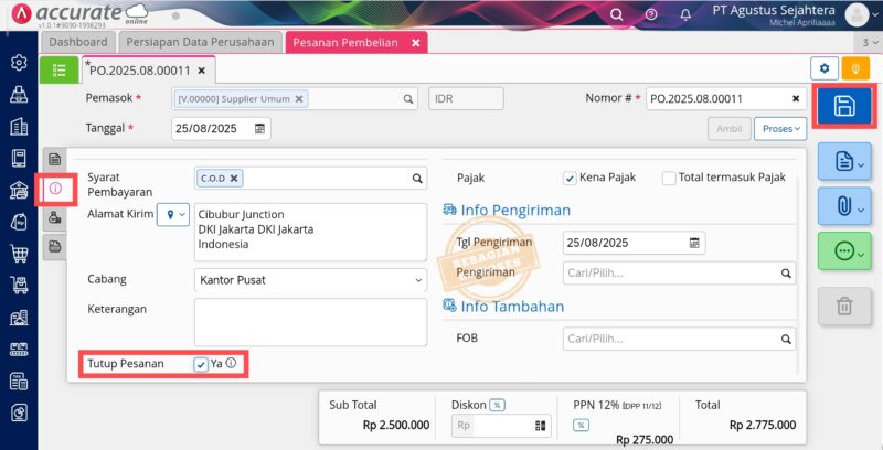 3. Klik pada pesanan pembelian yang akan dibatalkan, lalu klik tab Info Lainnya dan centang Ya pada informasi Tutup Pesanan.