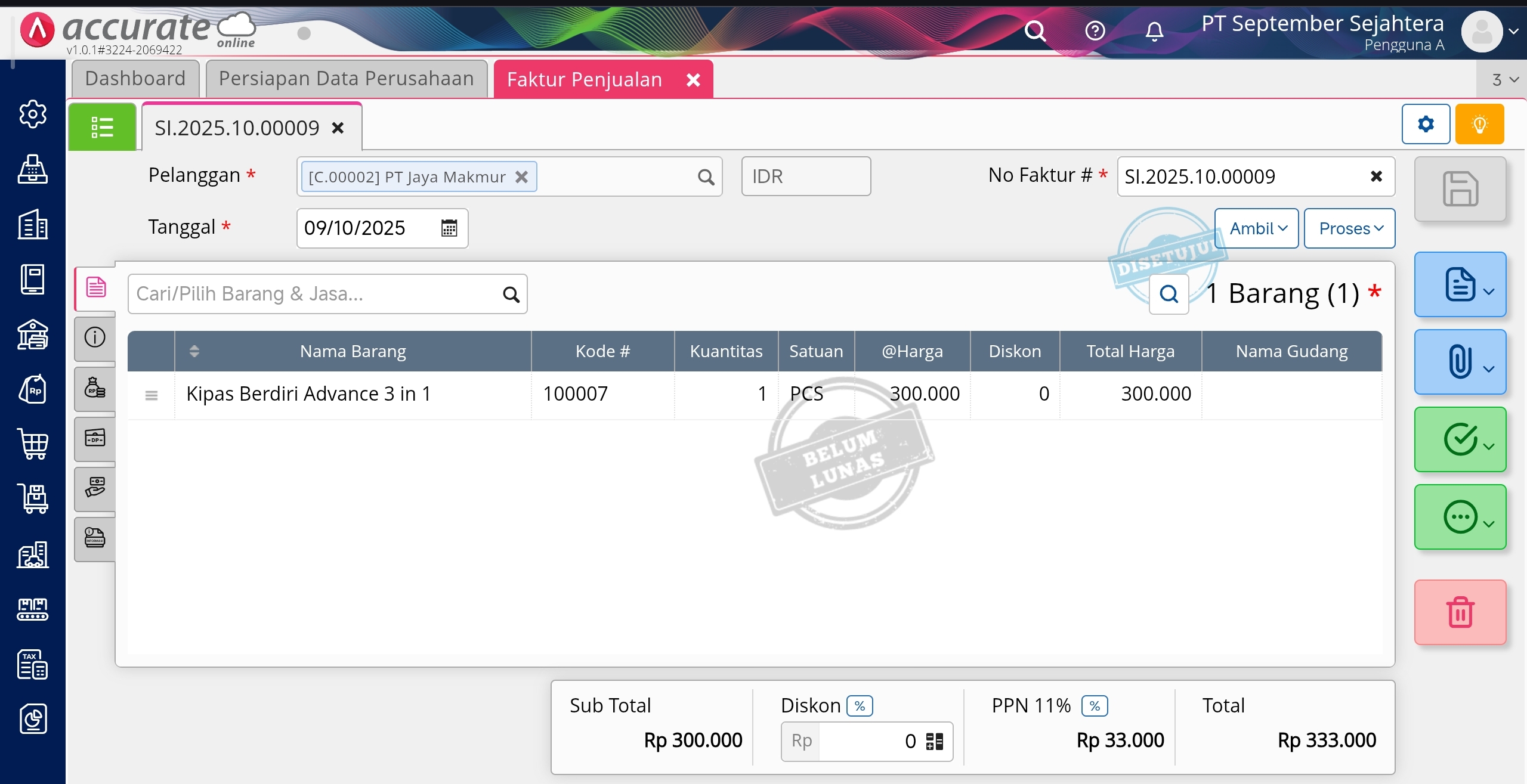 : untuk memproses pembayaran atas transaksi Faktur Penjualan tersebut. Jika faktur penjualan sudah lunas maka informasi ini akan menjadi abu-abu (tidak bisa diproses lagi).- Cari/Pilih Barang & Jasa : untuk memilih barang atau jasa yang dijual ke pelanggan anda.