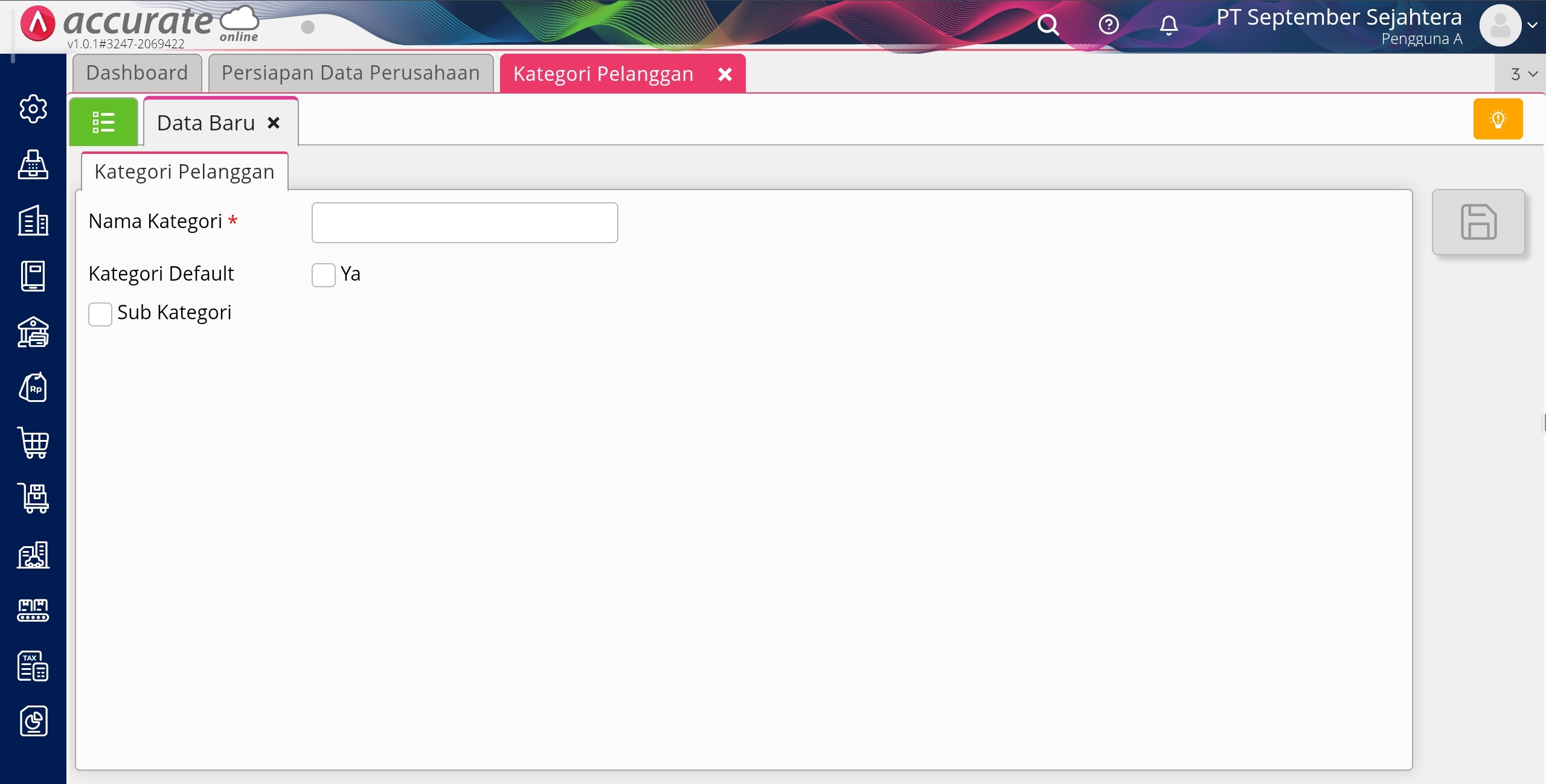 - Sub Kategori : dicentang jika nama kategori pelanggan yang dibuat adalah bagian dari nama kategori pelanggan tertentu.