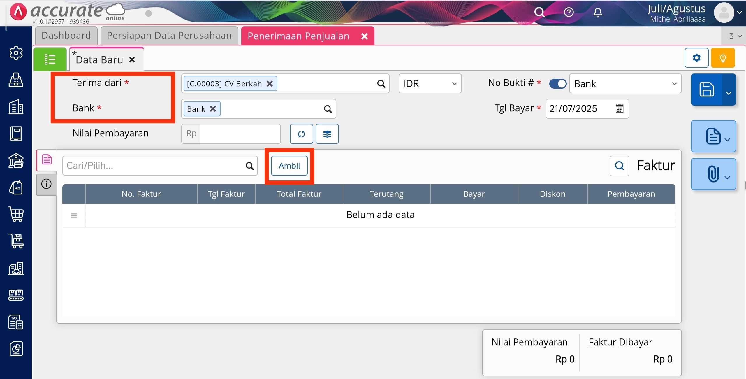 2. Lengkapi informasi Terima Dari, Bank, dan informasi yang lain, lalu klik Ambil.