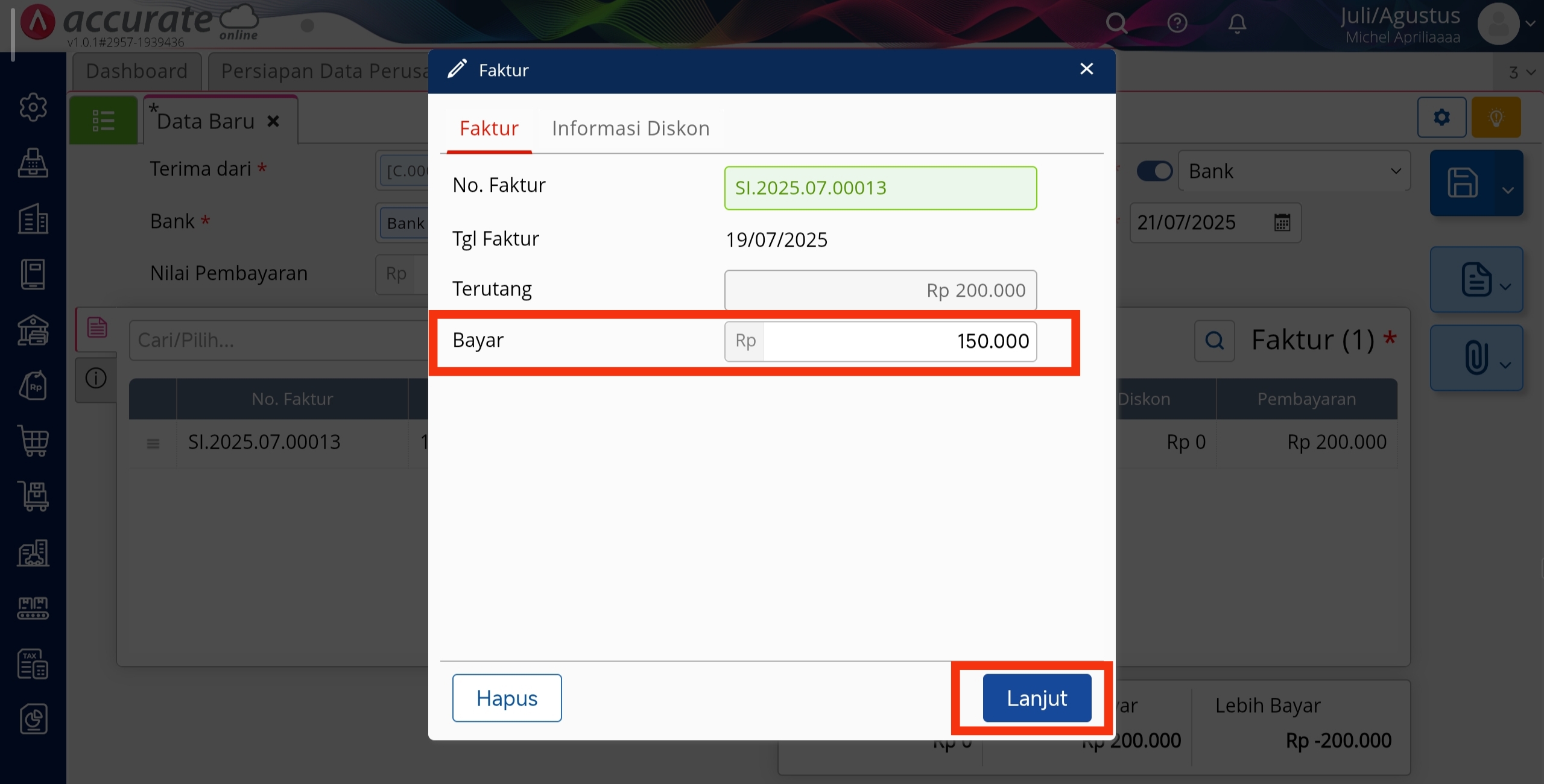 4. Klik pada baris faktur yang akan dibayar sebagian, lalu edit nilai pembayaran di kolom Bayar menjadi senilai yang Anda terima, kemudian klik Lanjut.
