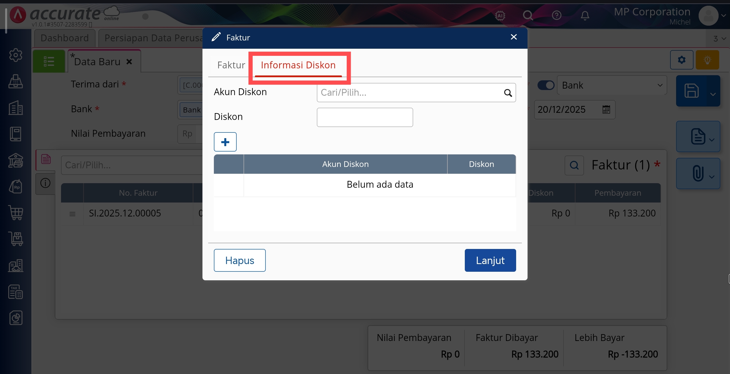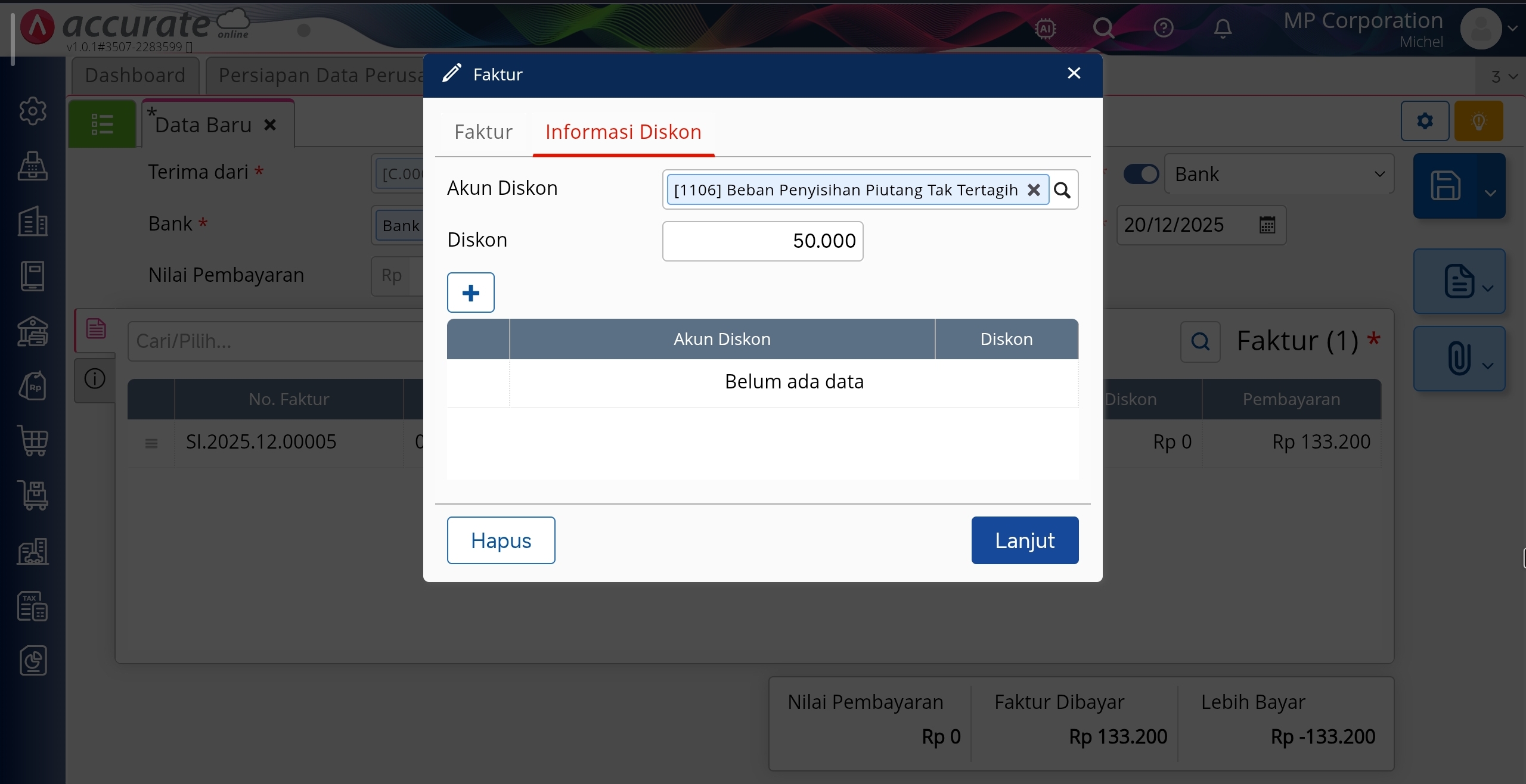 3. Pada tab Informasi Diskon, jika pada Preferensi nya sudah dibuatkan Akun Diskon, maka akan otomatis terisi di tampilan ini, contohnya menggunakan akun Beban Penyisihan Piutang Tak Tertagih / Bad Debt Expense, inputkan nilai Diskon nya agar Piutang yang ingin dihapuskan akan teralokasi ke akun tsb, klik Lanjut.