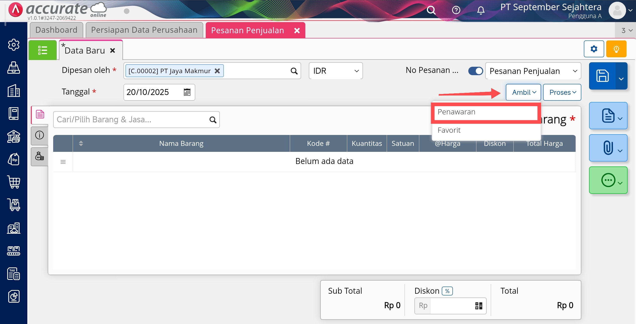 2. Lengkapi informasi Nama Pelanggan dan Tanggal, lalu klik tombol Ambil | Penawaran.
