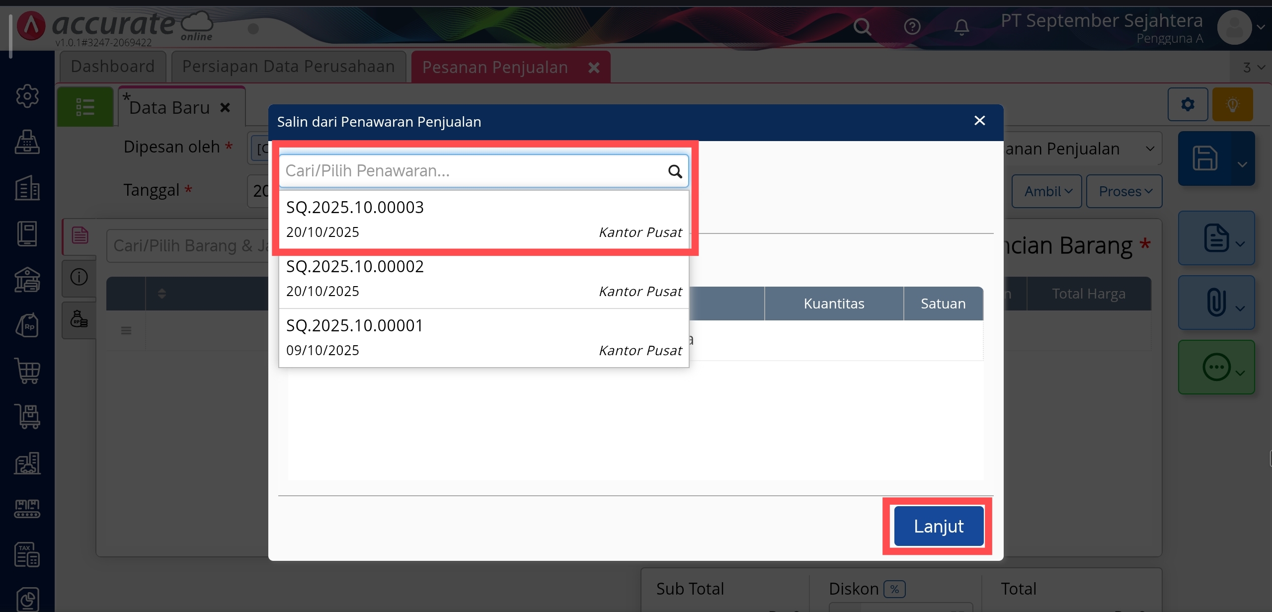3. Pilih Penawaran Penjualan yang akan dimasukan kedalam Pesanan Penjualan, lalu klik Lanjut.