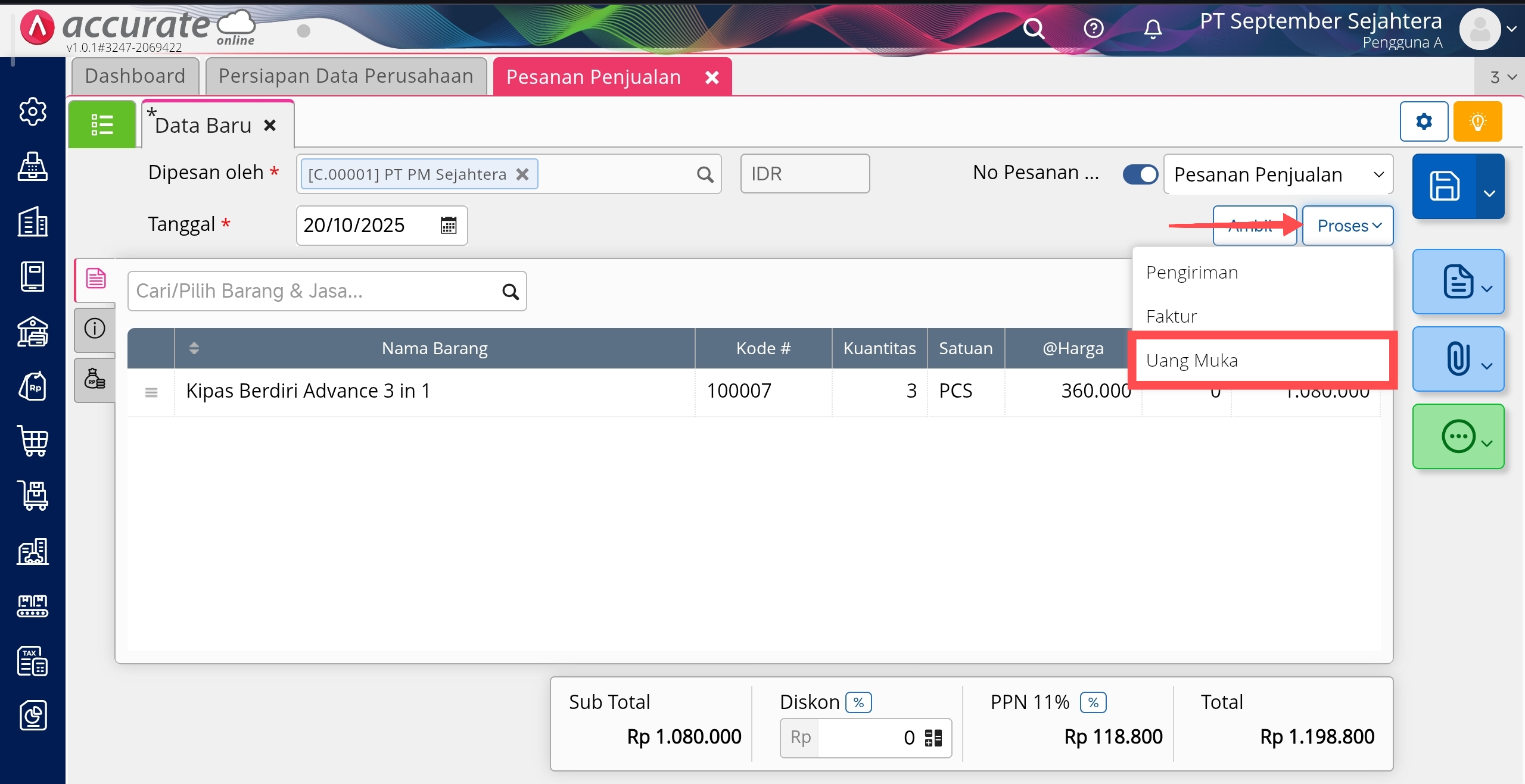 2. Isi Nama Pelanggan, Tanggal, Barang & Jasa, serta informasi tambahan, lalu klik Proses | Uang Muka.