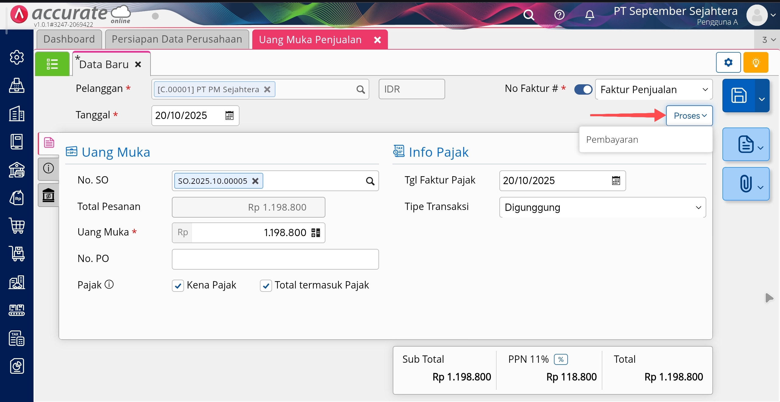 3. Akan muncul formulir Uang Muka Penjualan, masukan nilai DP/uang muka, lalu klik Proses | Pembayaran, untuk mengakui penerimaan atas pembayaran uang muka dari pelanggan.