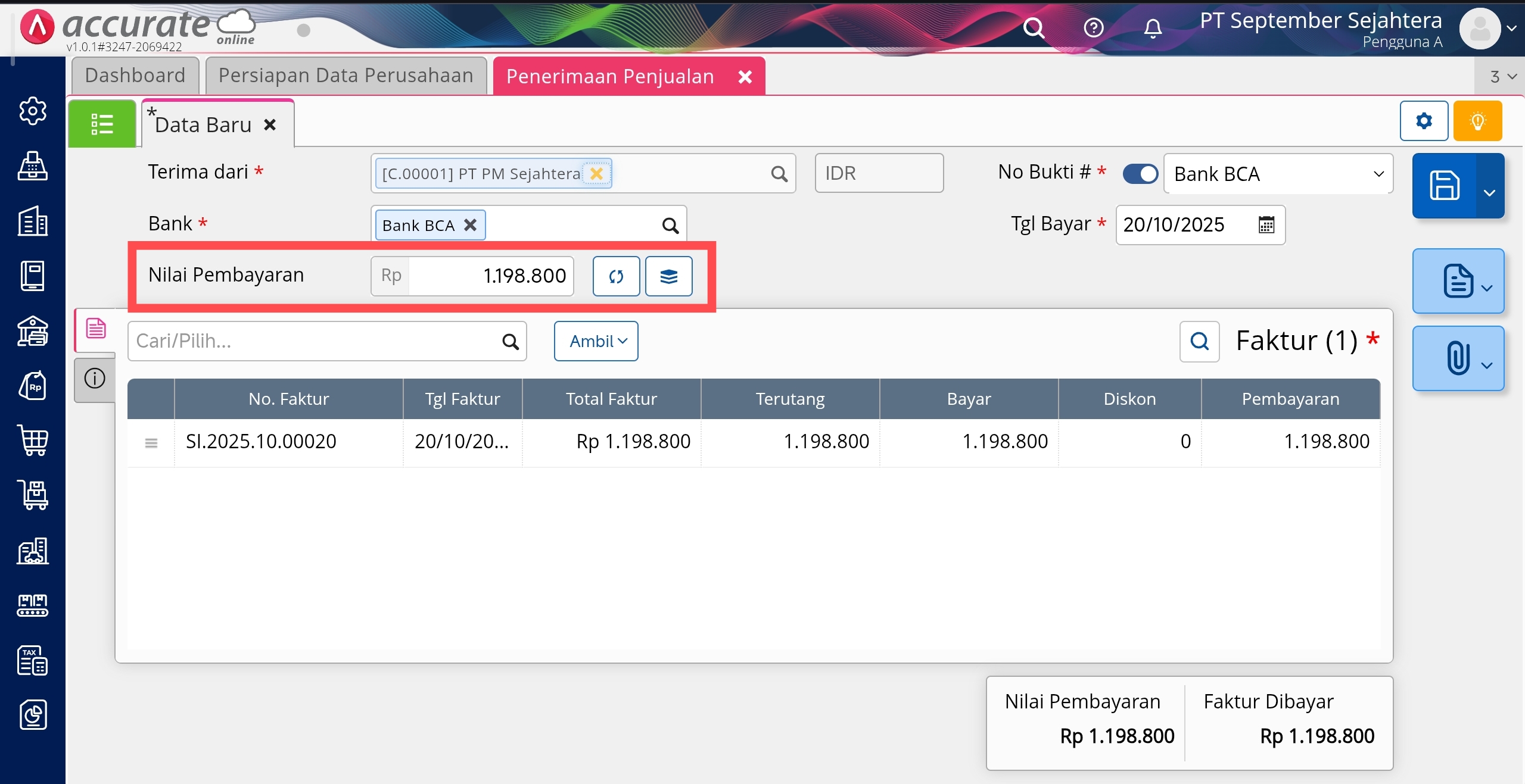 4. Akan muncul formulir Pembayaran Penjualan, pilih Kas/Bank yang digunakan, Tgl Bayar, lalu klik Hitung Nilai Pembayaran, kemudian klik Simpan.