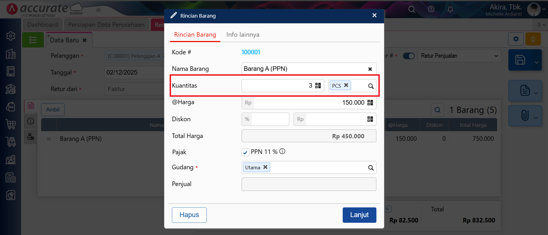 - Selanjutnya klik pada baris barang yang sudah ada pada formulir Retur Penjualan, lalu edit pada bagian Kuantitas, kemudian klik Lanjut.