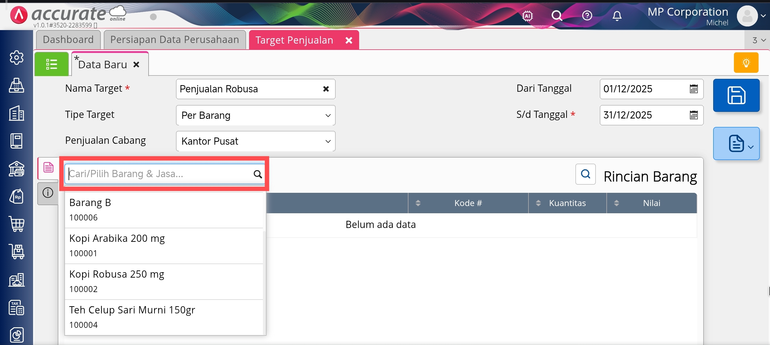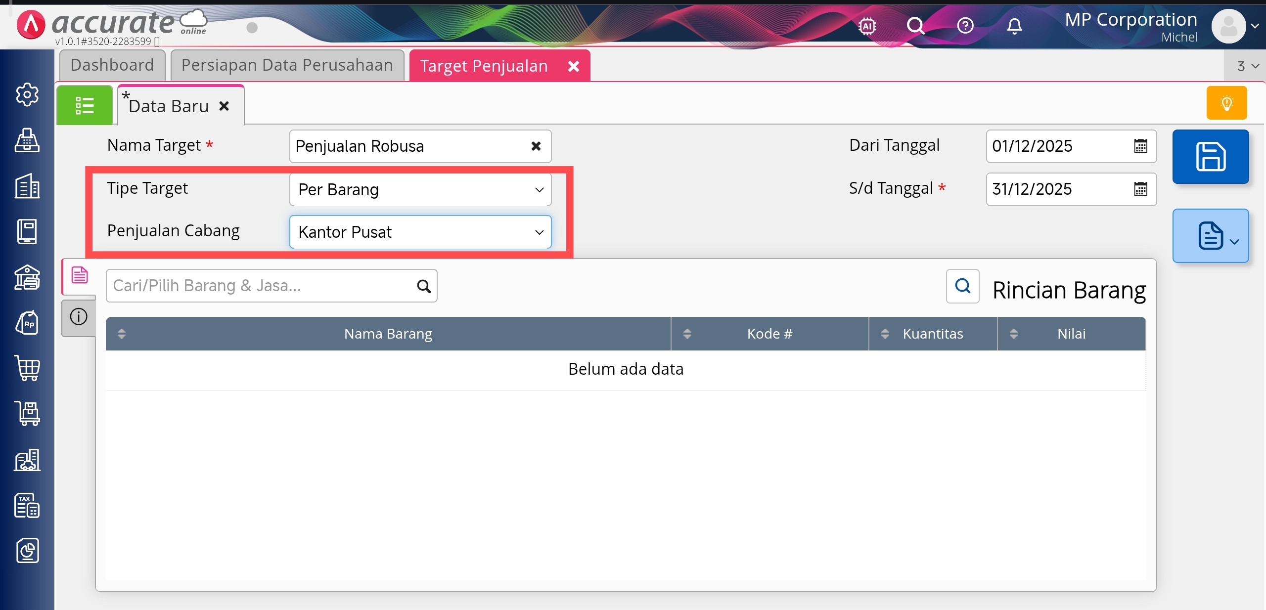 2. Lengkapi field-field pada formulir target penjualan, lalu pilih Tipe Target dan Kantor Cabang yang melakukan penjualan. Kemudian ambil barang di kolom Cari/Pilih Barang & Jasa.