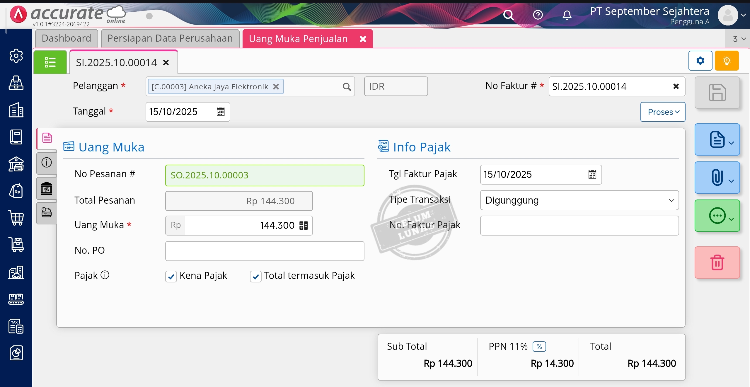 - Proses : untuk memproses penerimaan atas uang muka penjualan tersebut. Tombol akan menjadi abu-abu jika uang muka penjualan sudah dilakukan penginputan penerimaannya.