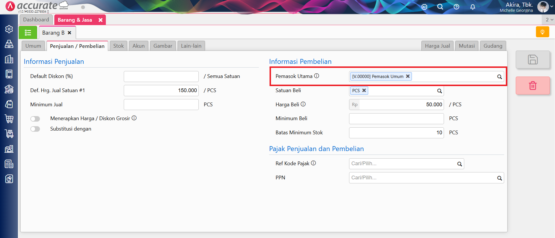 Misalnya, Pemasok umum merupakan Pemasok Utama untuk Barang B, maka saat memilih nama Pemasok Umum pada Barang Stok Minimum maka akan ditampilkan nama Barang B dan nama barang lainnya yang tidak diisikan Pemasok Utama-nya. Dan untuk barang yang mengisikan Pemasok Utama-nya adalah bukan Pemasok Umum tidak akan ditampilkan. (lihat gambar untuk ilustrasi).
