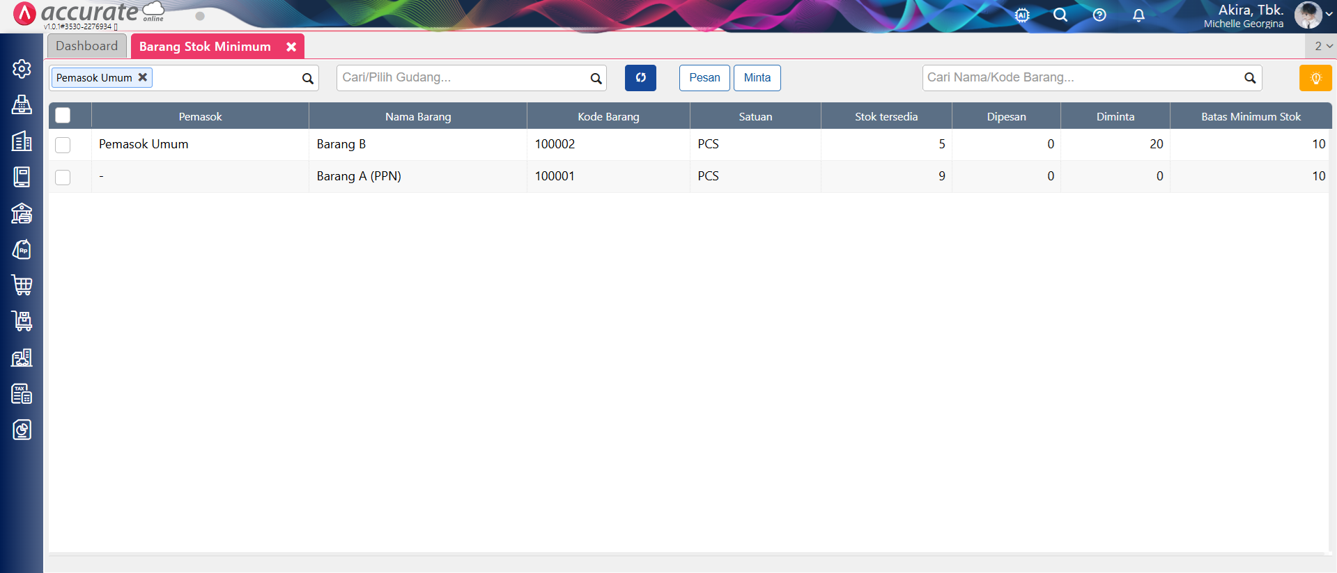 Setelah pengaturan jumlah stok minimum pada masing-masing barang, berikut ini langkah-langkah untuk membuat Pesanan Pembelian-nya :