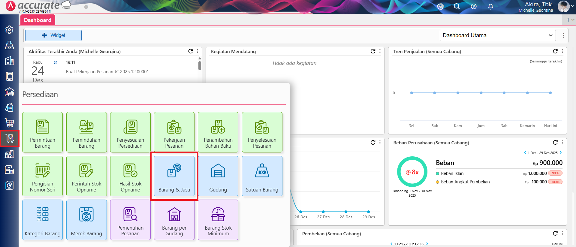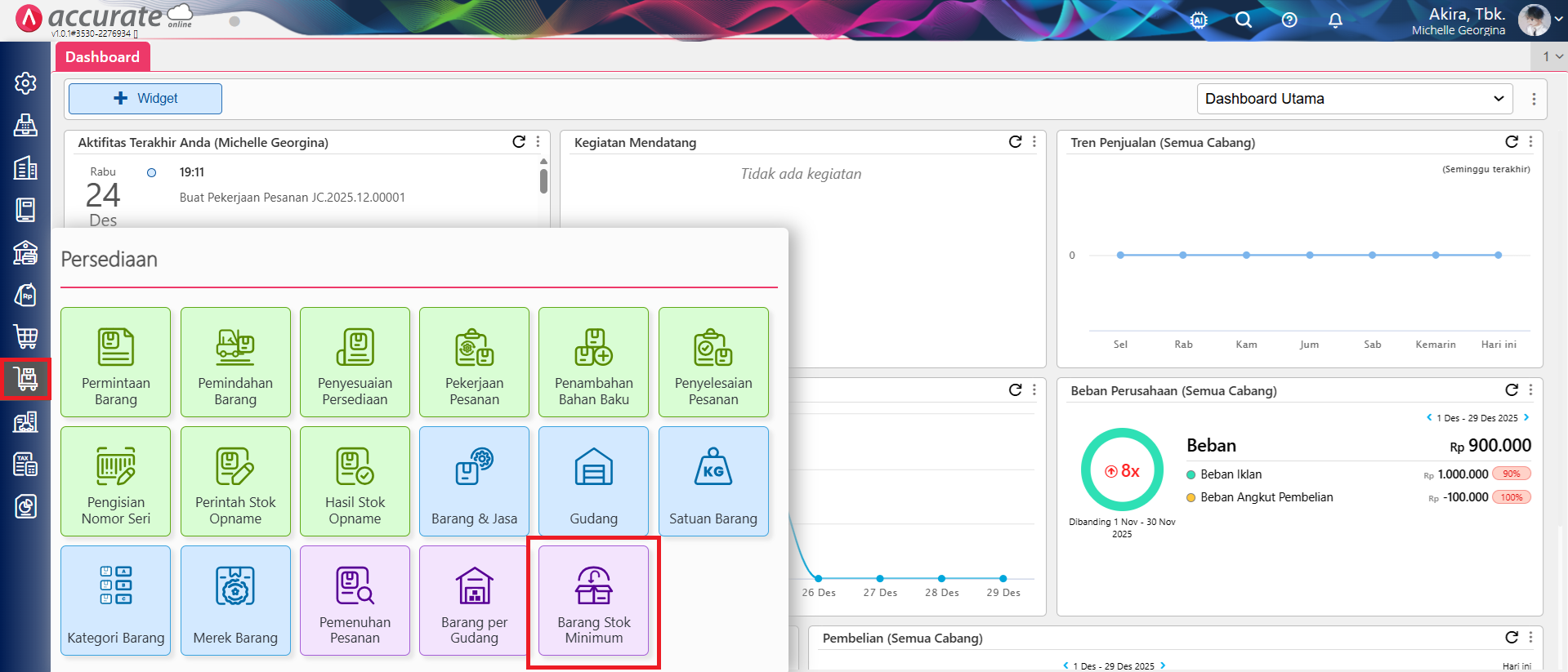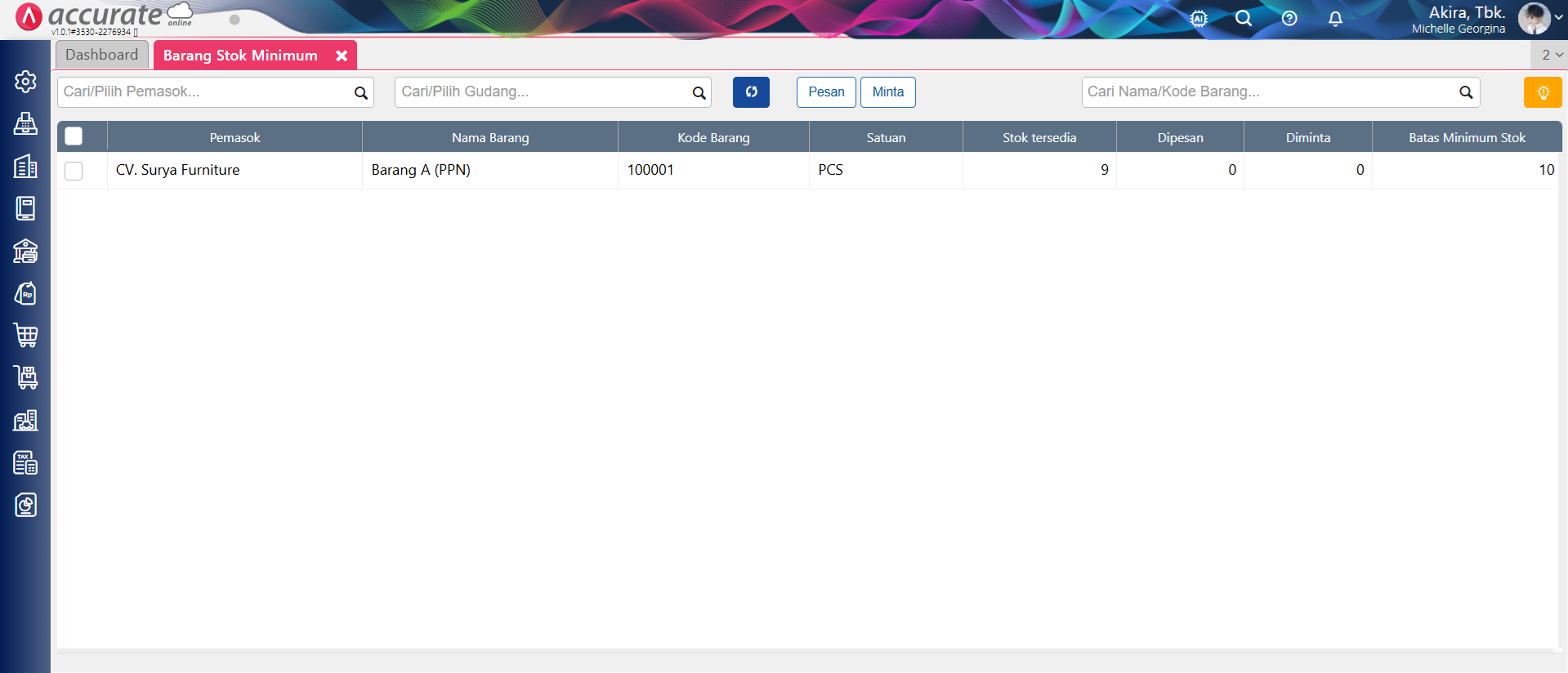 3. Selanjutnya, untuk melihat barang yang stok tersedia dibawah batas minimum stok, yaitu ke menu Persediaan | Barang Stok Minimum.