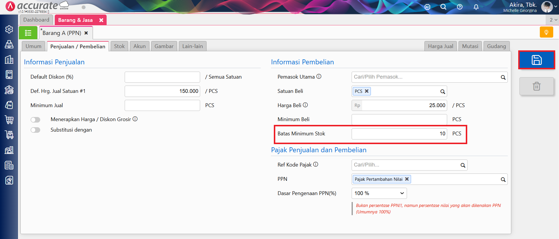 2. Klik Nama barang | Klik tab Penjualan/Pembelian | Masukkan minimum stok dikolom Batas Minimum Stok | Simpan (save)