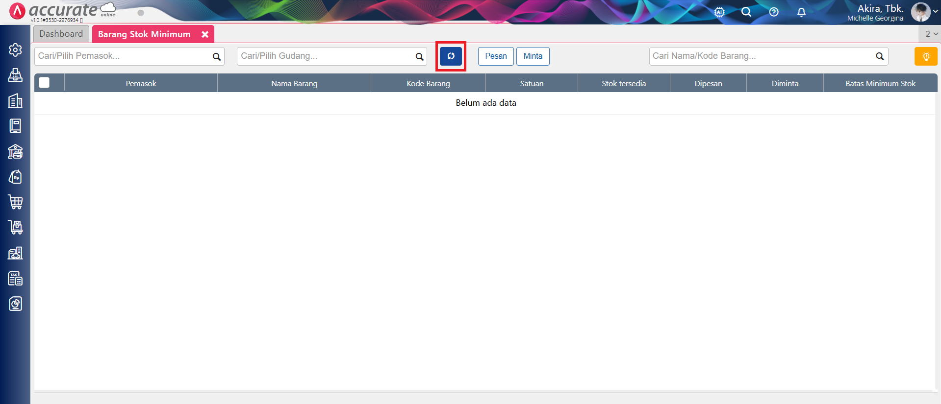 4. Klik Refresh, untuk menampilkan barang yang stok tersedia dibawah batas minimum stok.