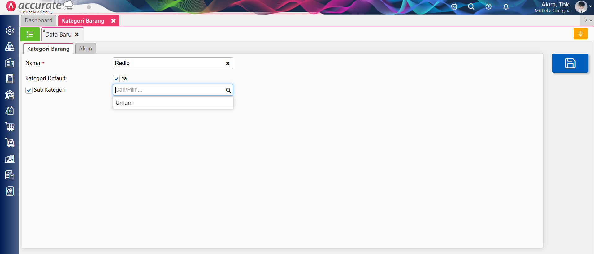 3. Pada tab Akun, secara otomatis akan mengikuti setting pada menu Pengaturan | Preferensi | Akun Perkiraan | Barang.