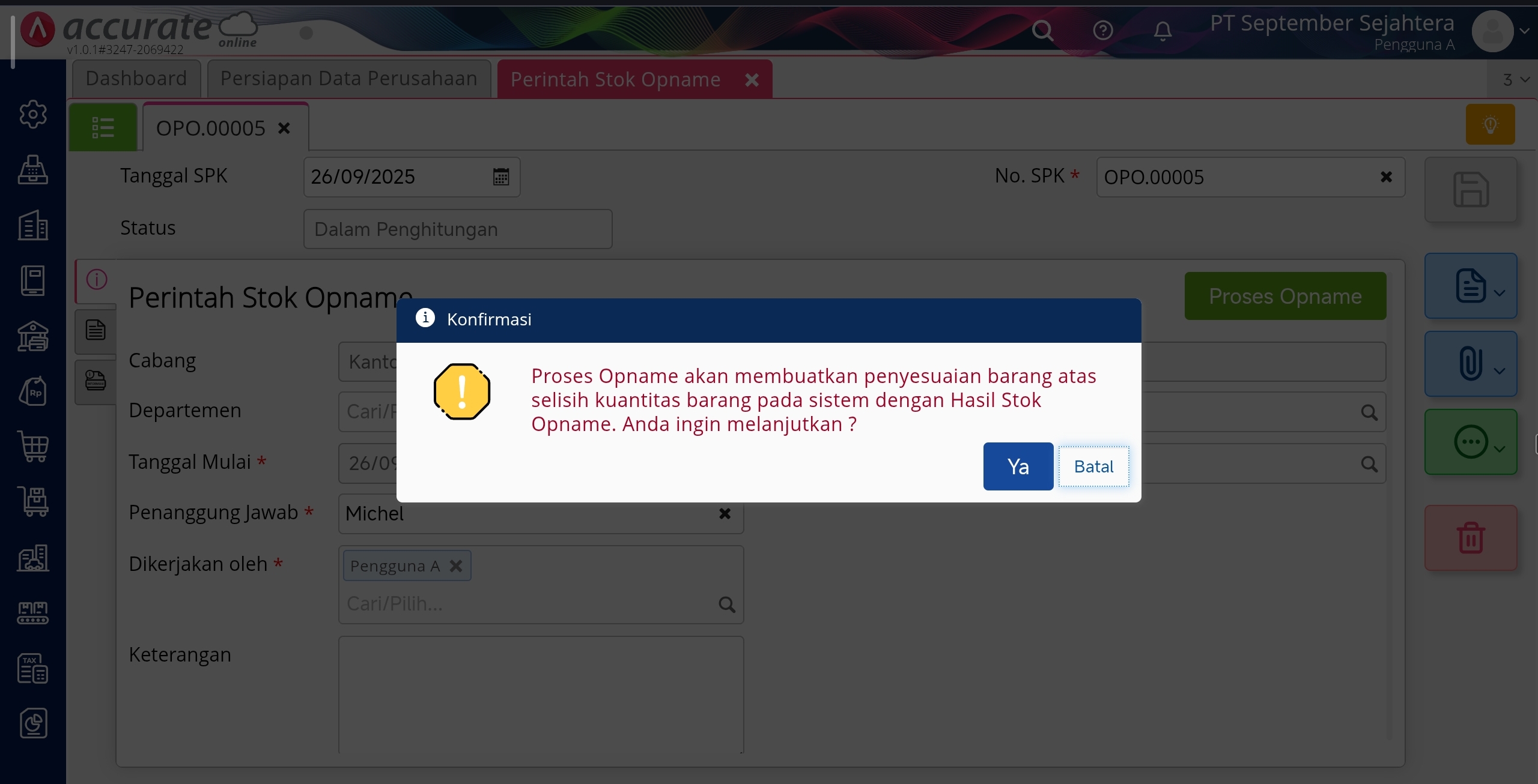 5. Anda klik Ya, jika sudah yakin dengan Hasil Stok Opname yang telah dibuat.