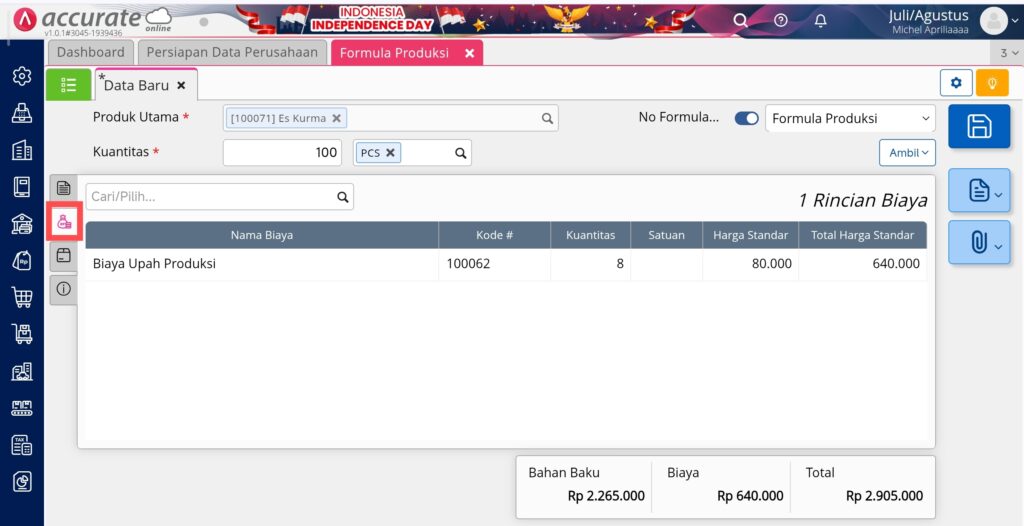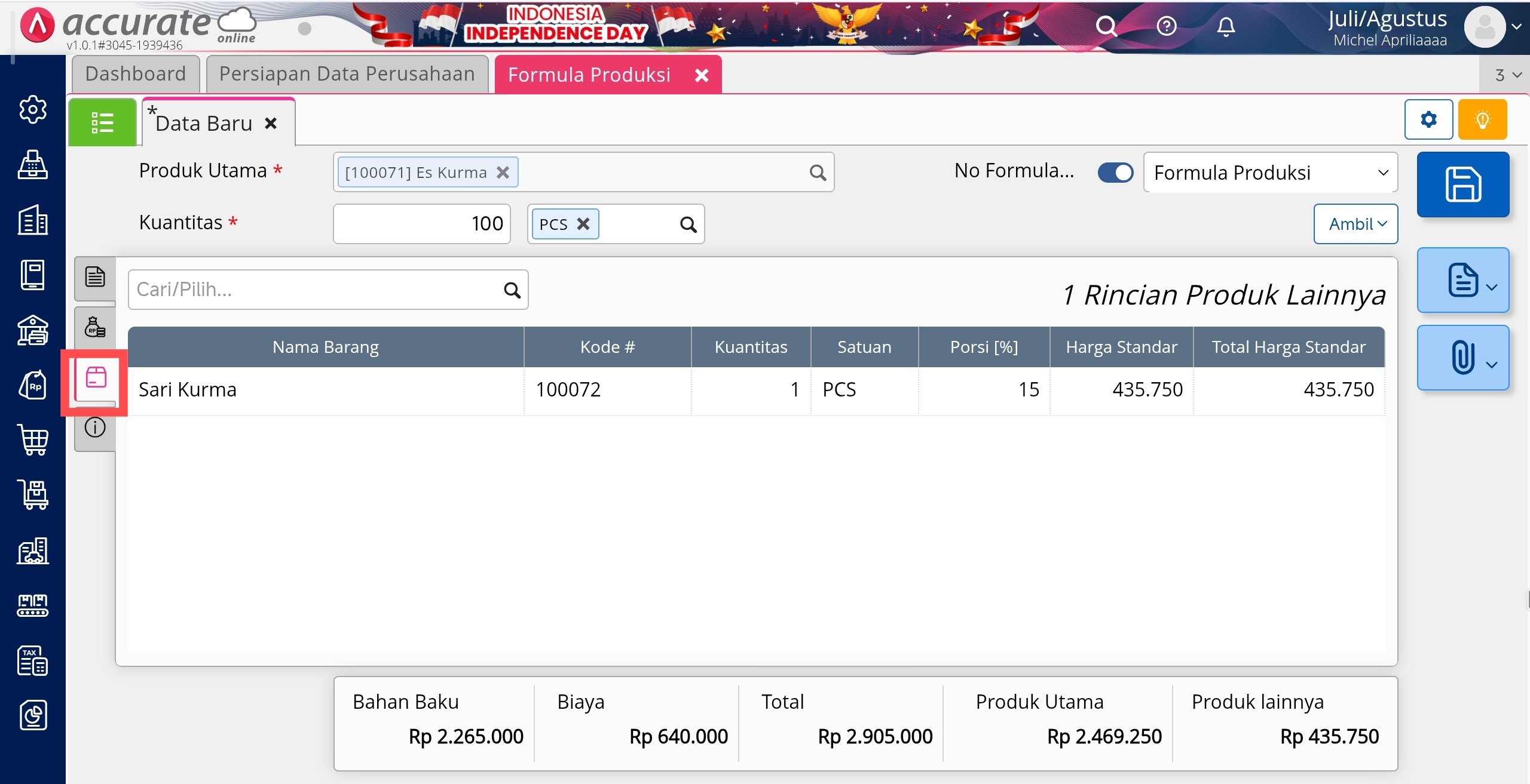 Catatan: Harga standar produksi akan otomatis dihitung sesuai porsi yang diisikan terhadap total harga standar di formula produksi tersebut.