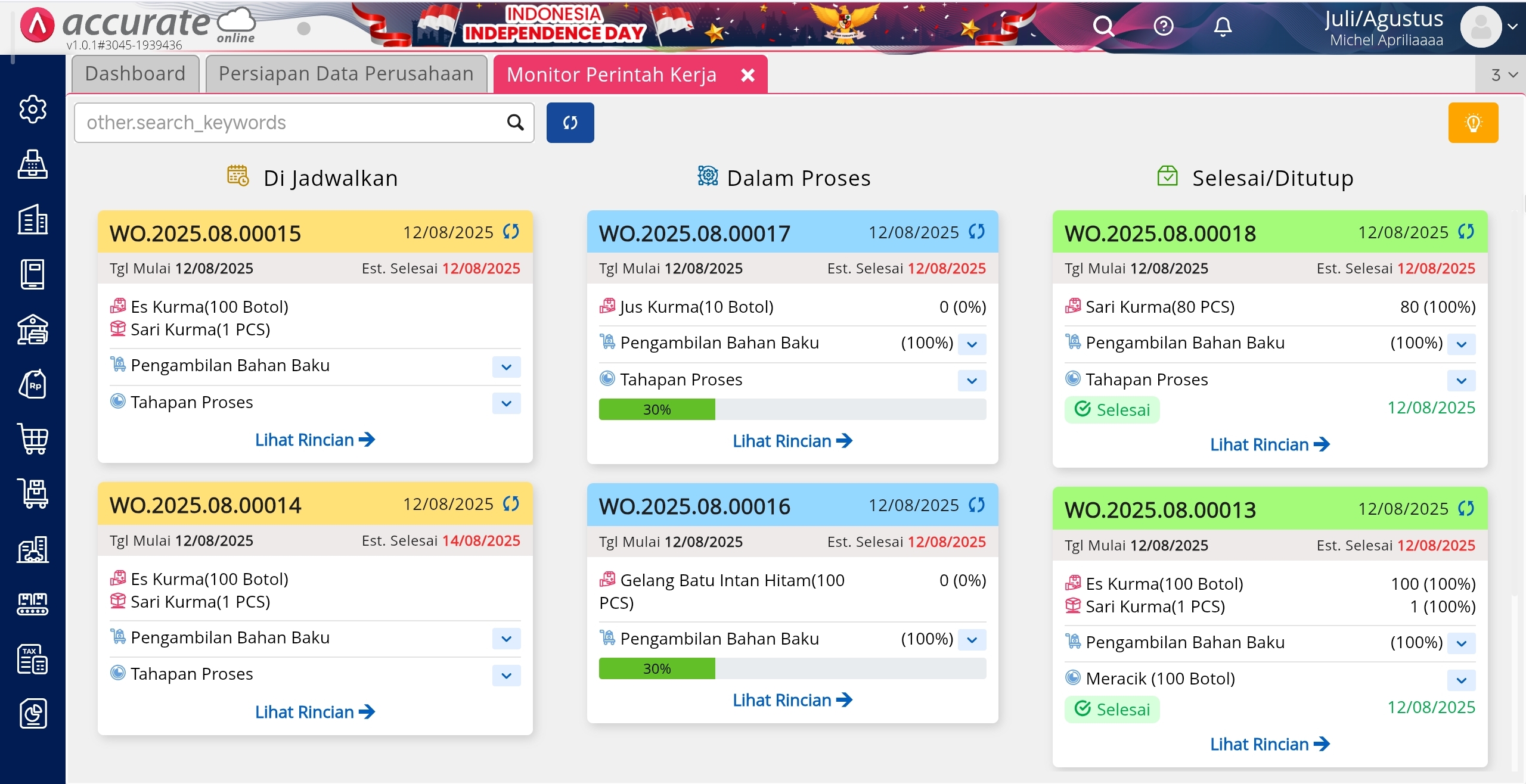 Merupakan formulir untuk melihat informasi rencana produksi dan kemajuan proses produksi-nya dalam rentang waktu tertentu, yaitu sesuai dengan pengaturan rentang waktu yang anda isikan pada menu Preferensi. Pada menu ini, akan diinformasikan rencana produksi sesuai dengan Surat Perintah Kerja-nya.