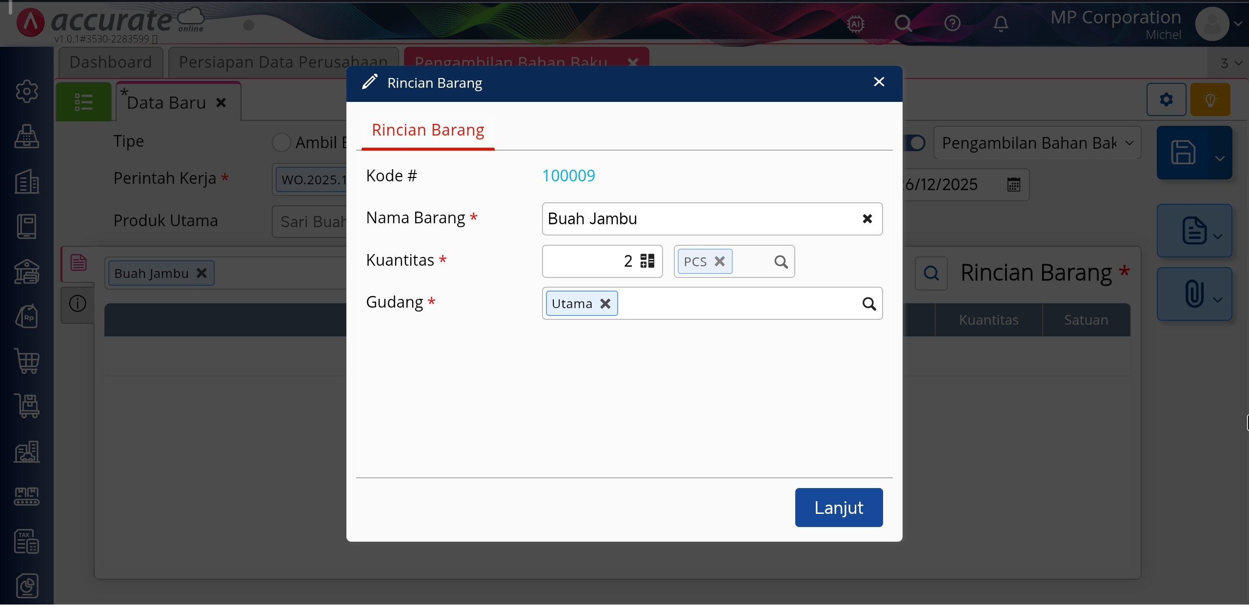 1. Masuk menu Manufaktur |Pengambilan Bahan Baku.