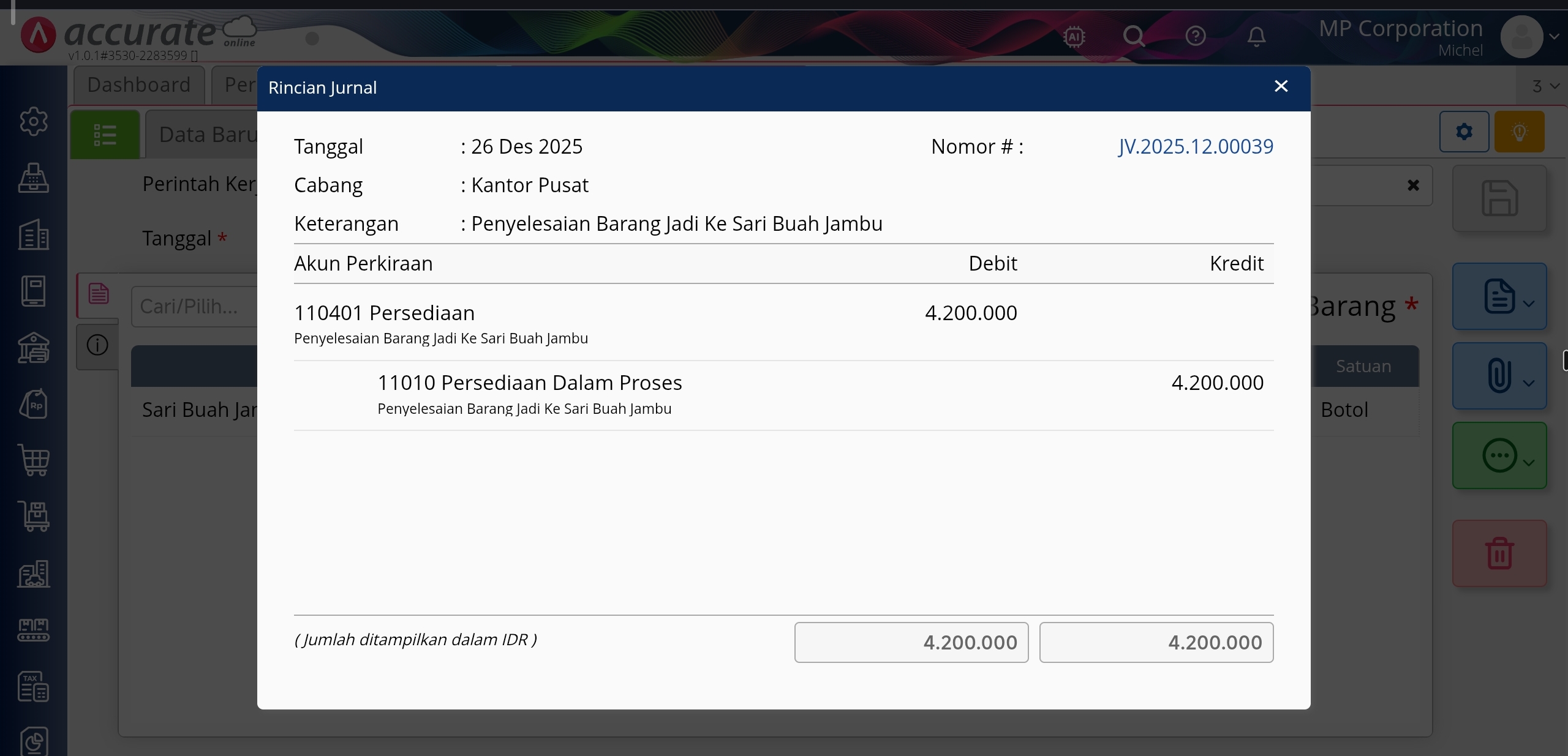 4. Simpan transaksi penyelesaian barang jadi dan jurnal yang terbentuk adalah sebagai berikut.