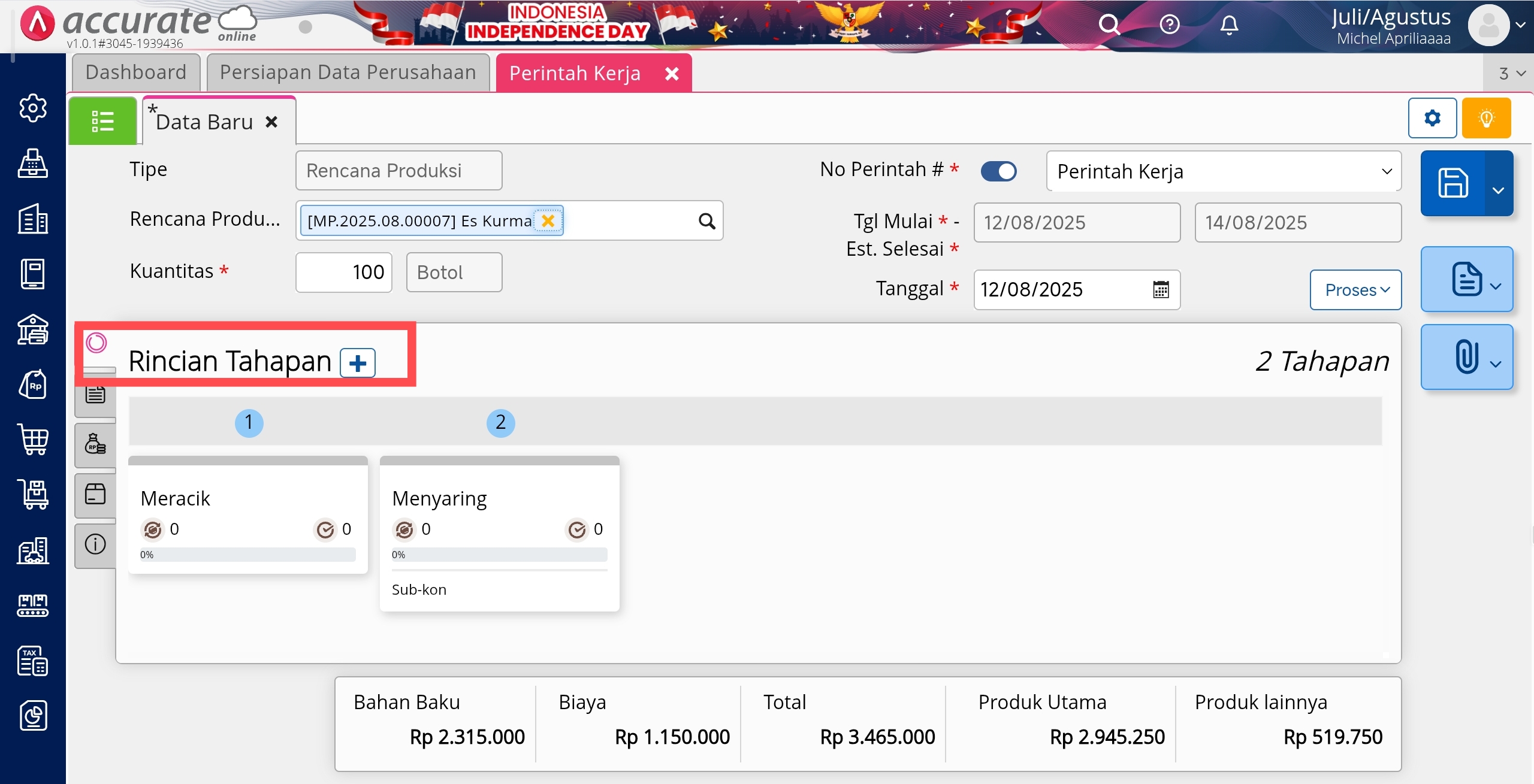 Kemudian setelah mengaktifkan fitur tersebut, pada saat pengguna ingin membuat Perintah Kerja maka akan tampil tab tambahan yaitu tab Rincian Tahapan.