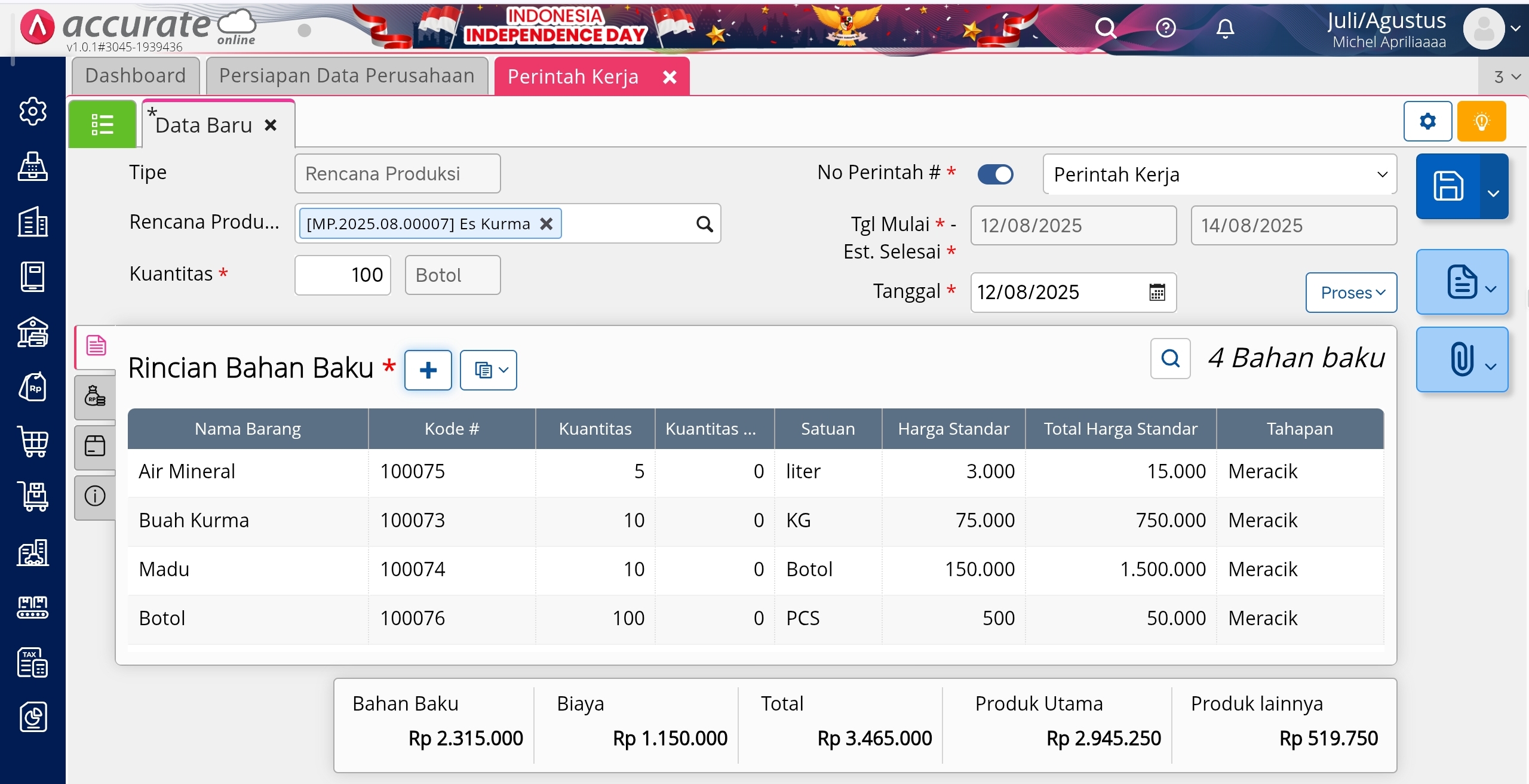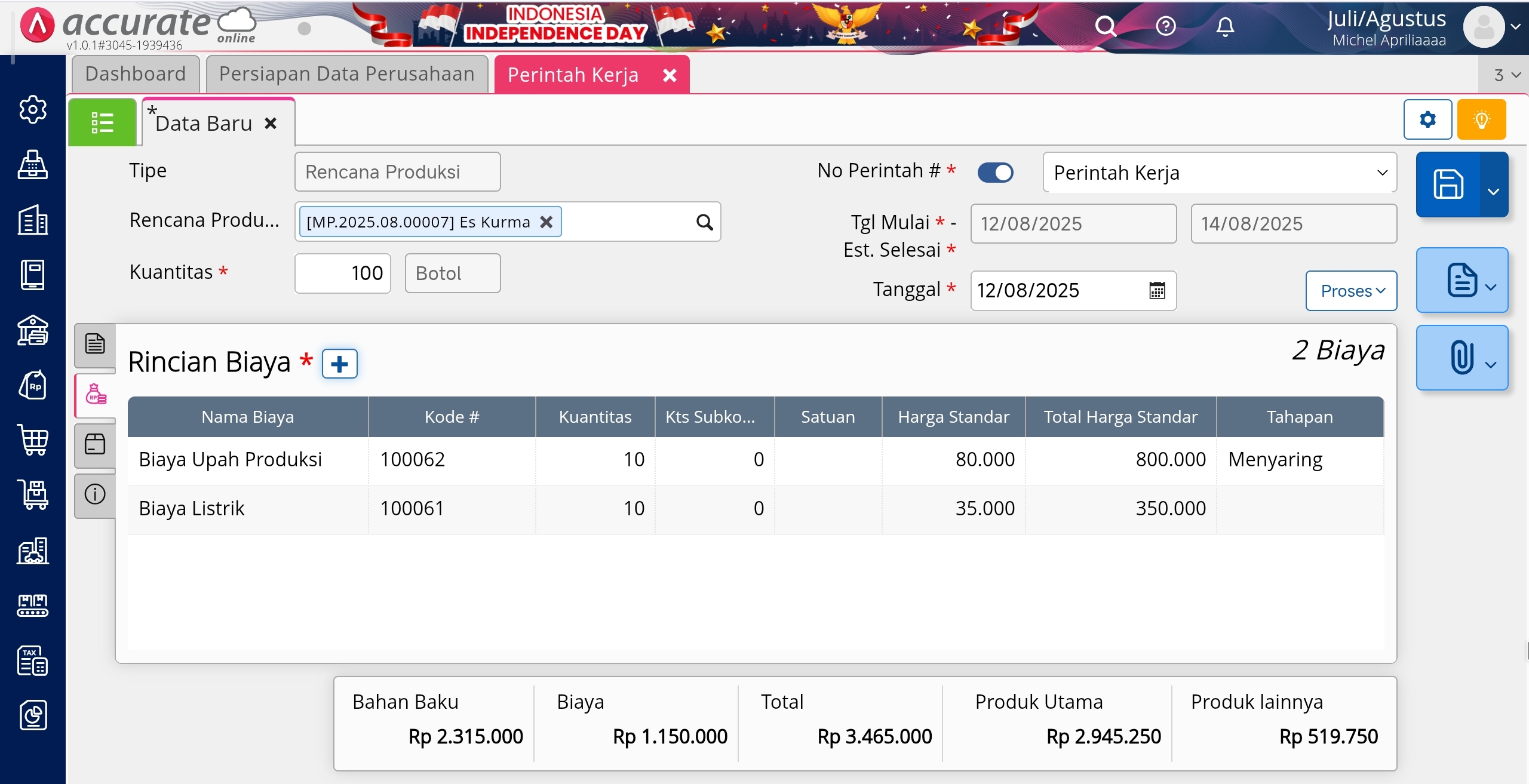 2. Pilih Tipe Perintah Kerja yaitu dari Rencana Produksi, Formula Produksi, atau Produk. Misalnya Anda memilih Tipe Rencana Produksi, maka pilih nomor Rencana Produksi pada kolom Rencana Produksi, dan akan tampil kuantitas serta rincian rencana produksinya pada Perintah Kerja. Jika perlu dilakukan pengubahan jumlah produk yang diproduksi ataupun jumlah bahan baku serta biaya yang digunakan, bisa anda lakukan pengubahan pada perintah kerja ini.