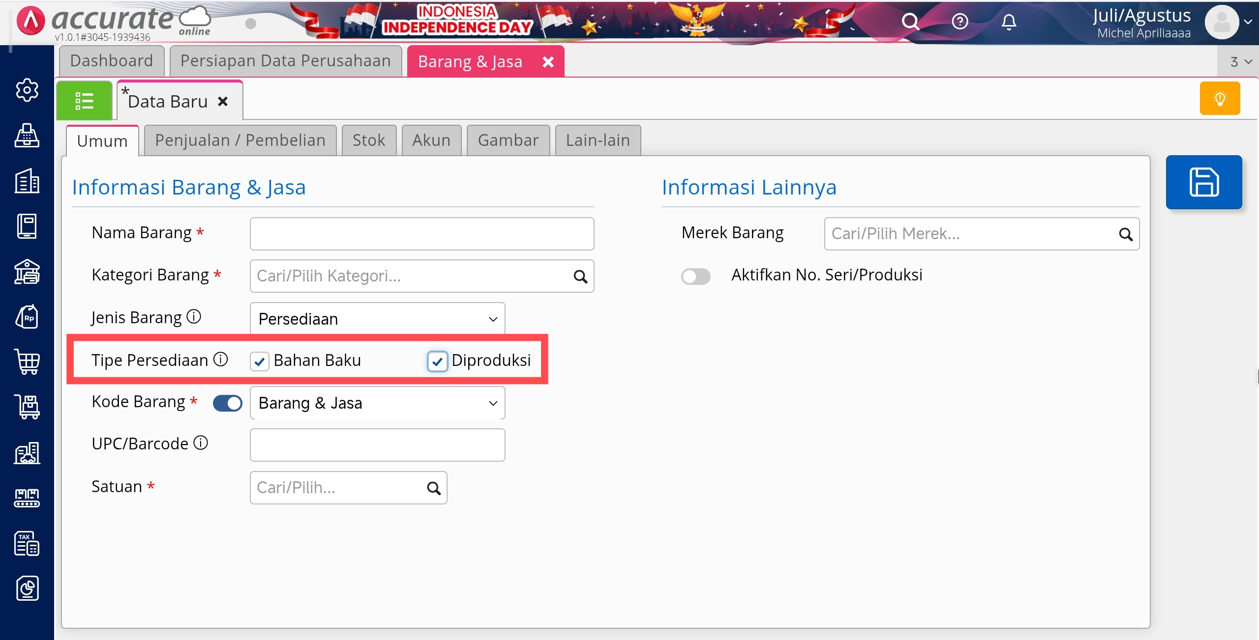 - Bahan Baku : dicentang pilihan ini jika barang tersebut bisa digunakan sebagai bahan baku dalam proses produksi. Sehingga nama barang tersebut akan tampil dalam pencarian di Formula Produksi di bagian Bahan Baku/Barang dan dalam pembuatan Nilai Standar Biaya Produksi.