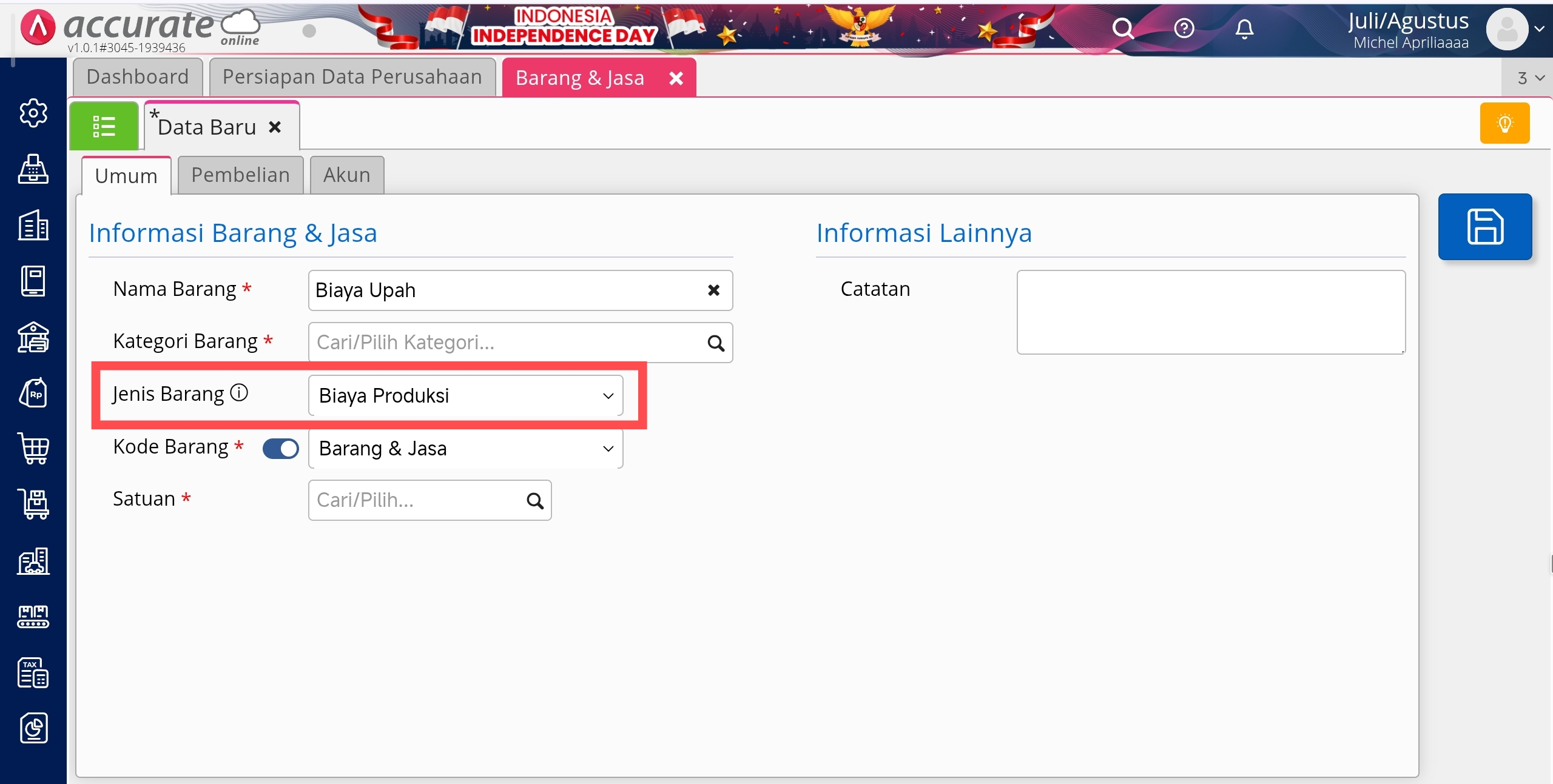 - Biaya Produksi : memilih jenis barang dengan Biaya Produksi jika anda ingin membuat biaya-biaya yang terlibat dalam proses produksi. Sehingga biaya-biaya ini bisa diisikan dalam Formula Produksi di bagian Biaya Produksi, serta dalam pembuatan nilai Standar Biaya Produksi.