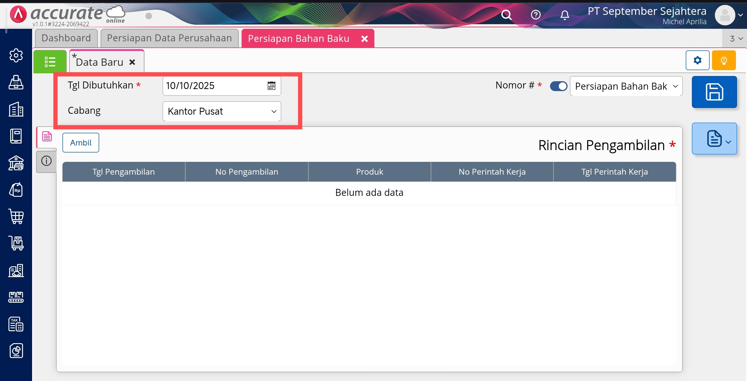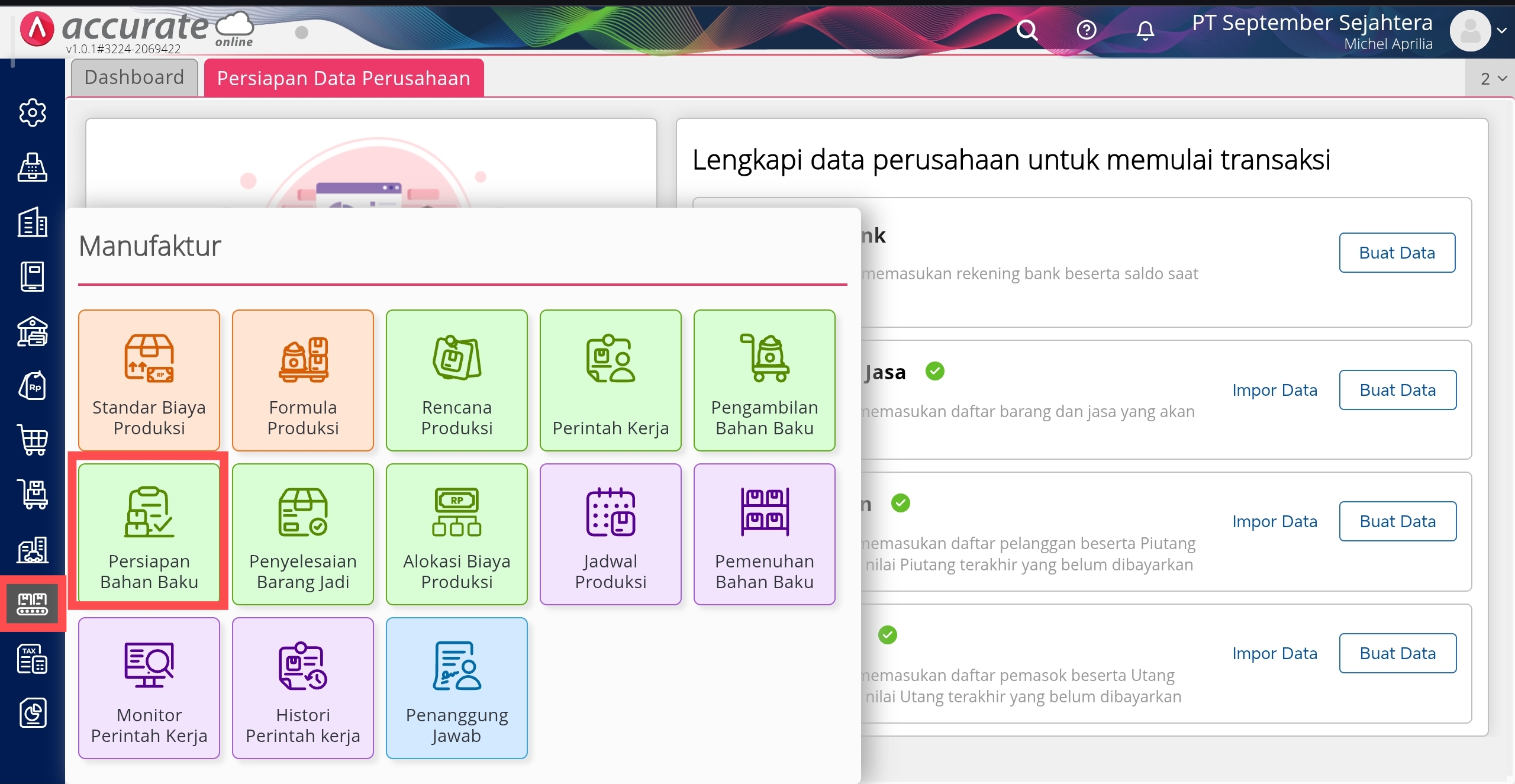 - Masuk ke menu Manufaktur | Persiapan Bahan Baku.