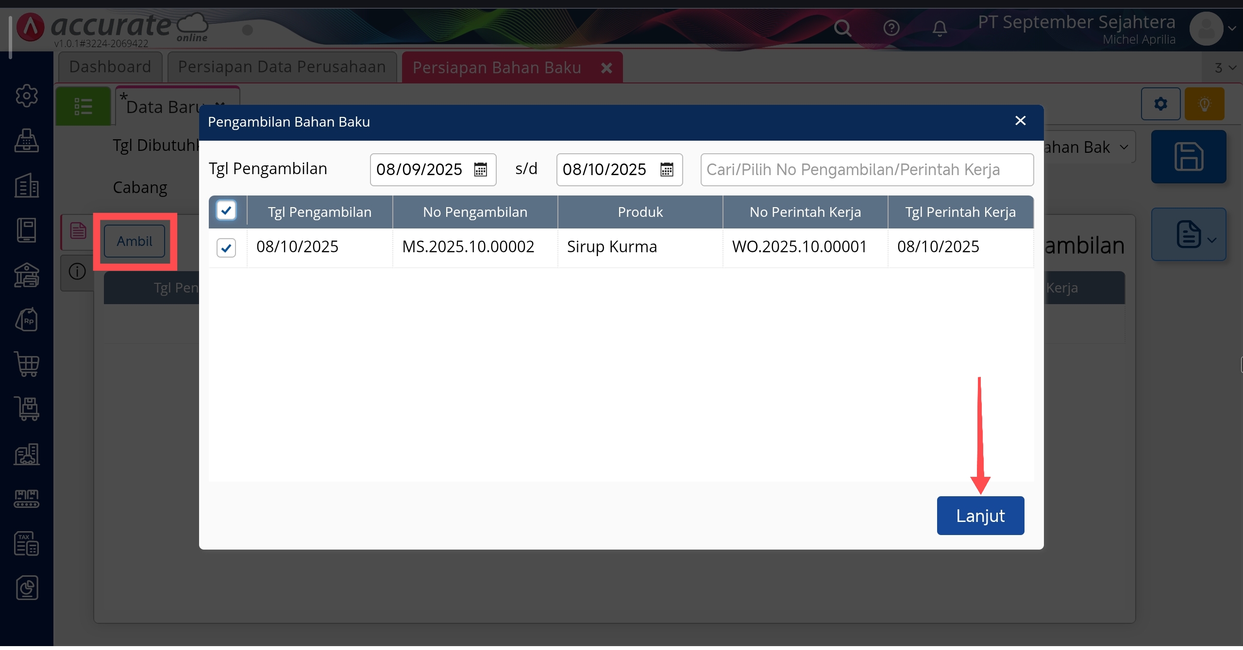 - Kemudian klik tombol Ambil, dan pilih nomor pengambilan bahan baku, lalu klik Lanjut.