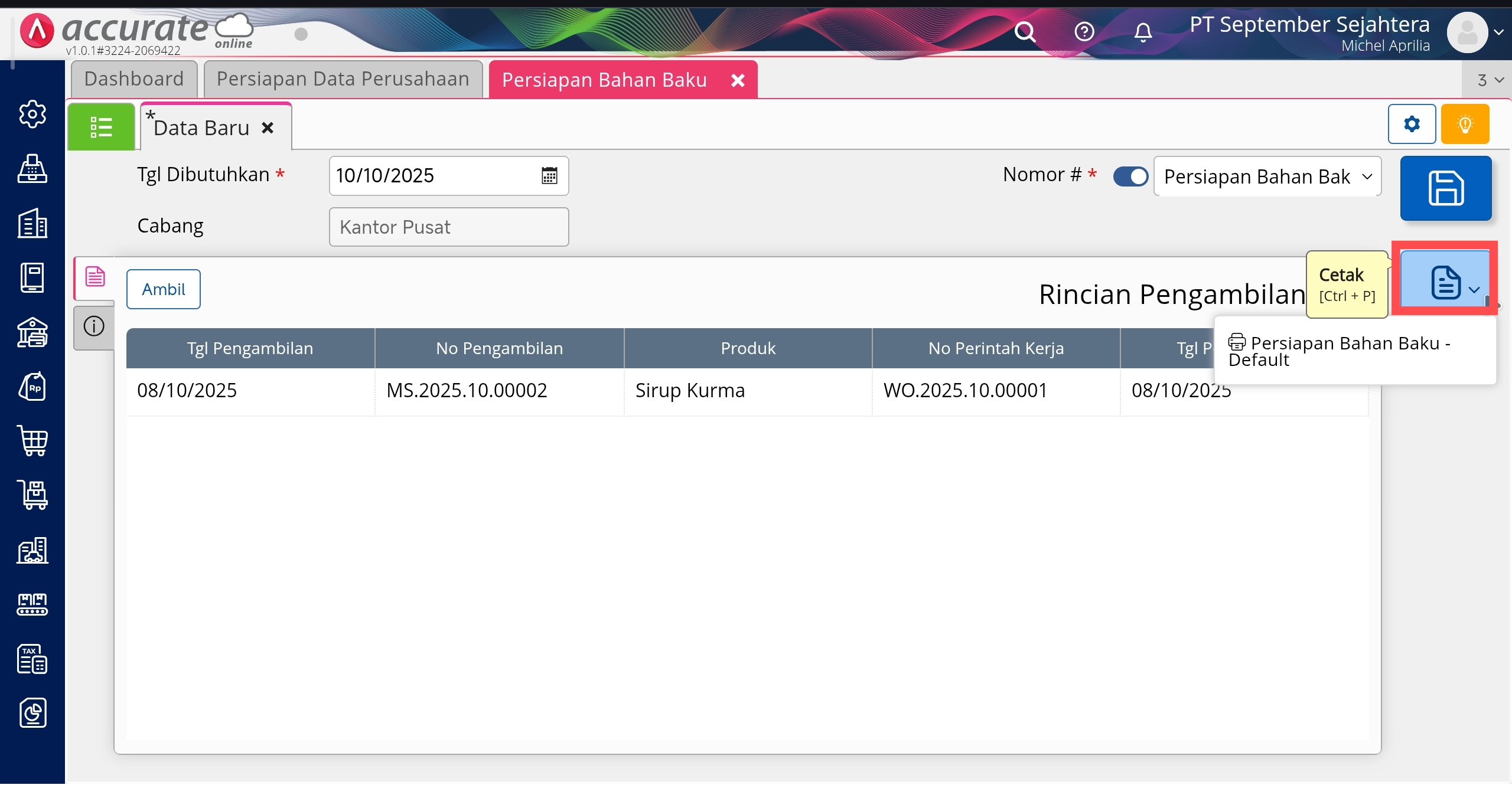 - Simpan transaksi Persiapan Bahan Baku. Jika anda ingin mencetak Persiapan Bahan Baku, maka klik Cetak dan tampilannya akan seperti berikut ini.