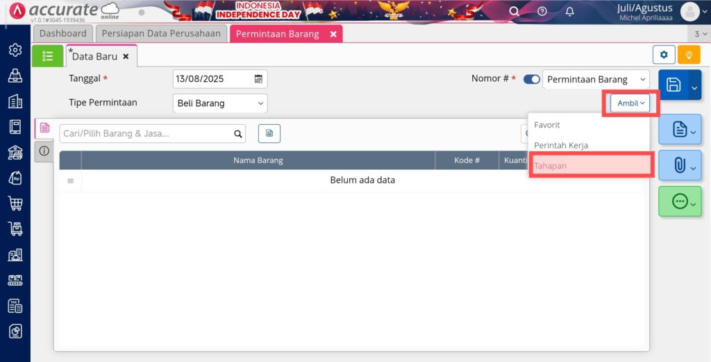 2. Buat Permintaan Barang atas Biaya Produksi yang di-subkon melalui menu Persediaan, kemudian klik Ambil dan pilih Tahapan lalu pilih Tahapan Produksi yang dimaksud dan klik Lanjut.