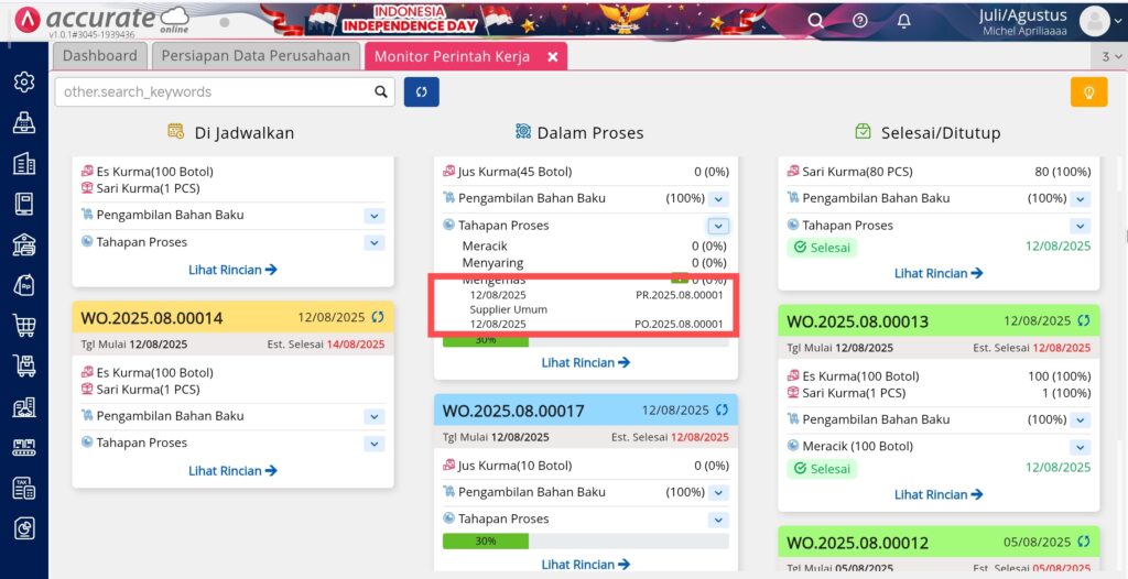 5. Selain itu Accurate Online juga akan otomatis membuatkan tahapan proses mulai atas biaya subkon tersebut saat anda membuat Permintaan Barang. Dan akan membuatkan proses Selesai Tahapan Produksi saat anda membuat transaksi Penerimaan Barang atau Faktur Pembelian atas Permintaan Barang dari Biaya Produksi yang disubkon tersebut. Anda bisa melakukan pengecekan melalui menu Manufaktur | Tahapan Proses.