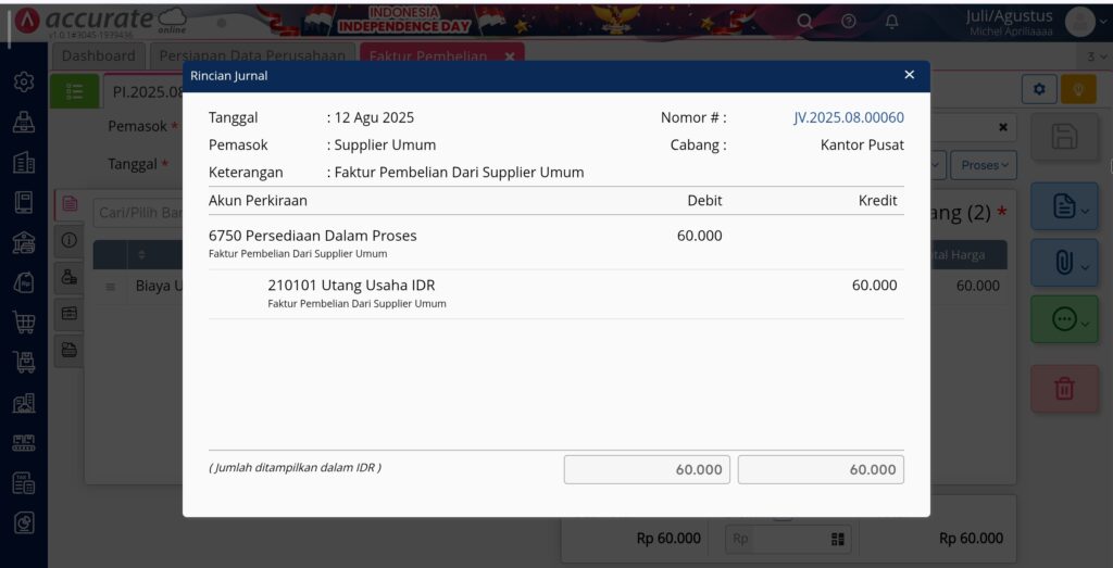 6. Dan jika Permintaan Barang atas Biaya Produksi Subkon tersebut dibuatkan transaksi Penerimaan Barang ataupun Faktur Pembelian-nya, maka jurnal yang terbentuk akan otomatis masuk ke akun Perintah Kerja. Seperti contoh berikut ini.
