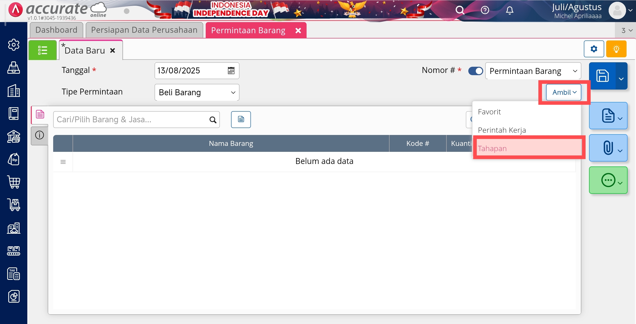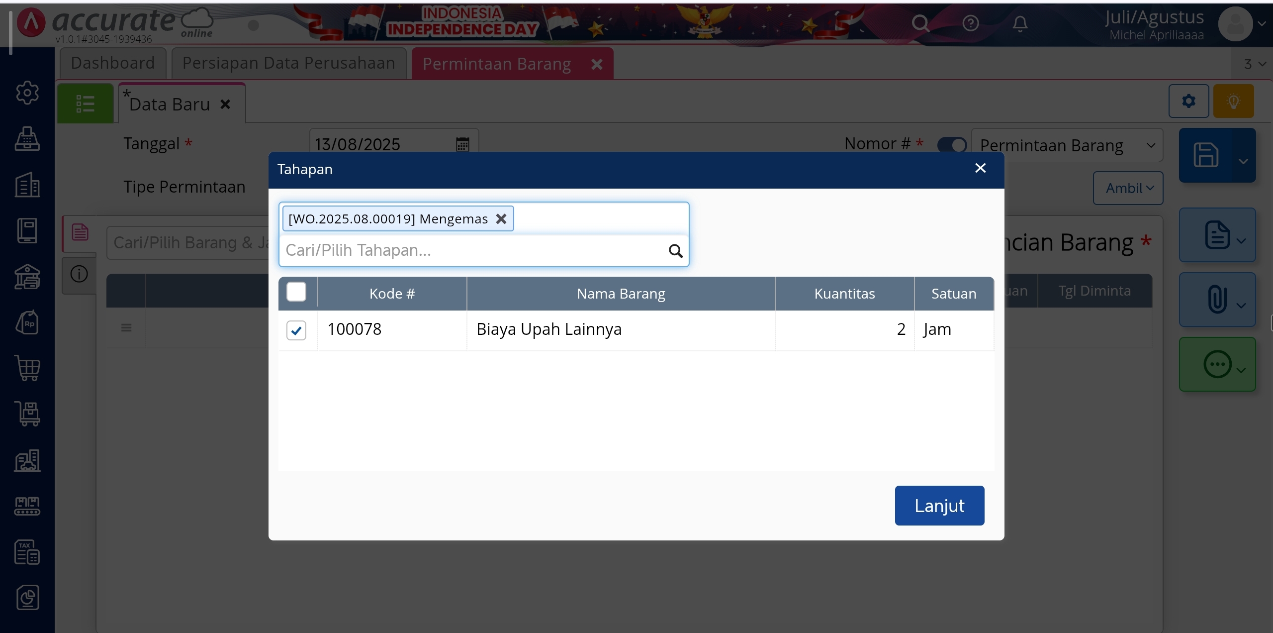 2. Buat Permintaan Barang atas Biaya Produksi yang di-subkon melalui menu Persediaan, kemudian klik Ambil dan pilih Tahapan lalu pilih Tahapan Produksi yang dimaksud dan klik Lanjut.