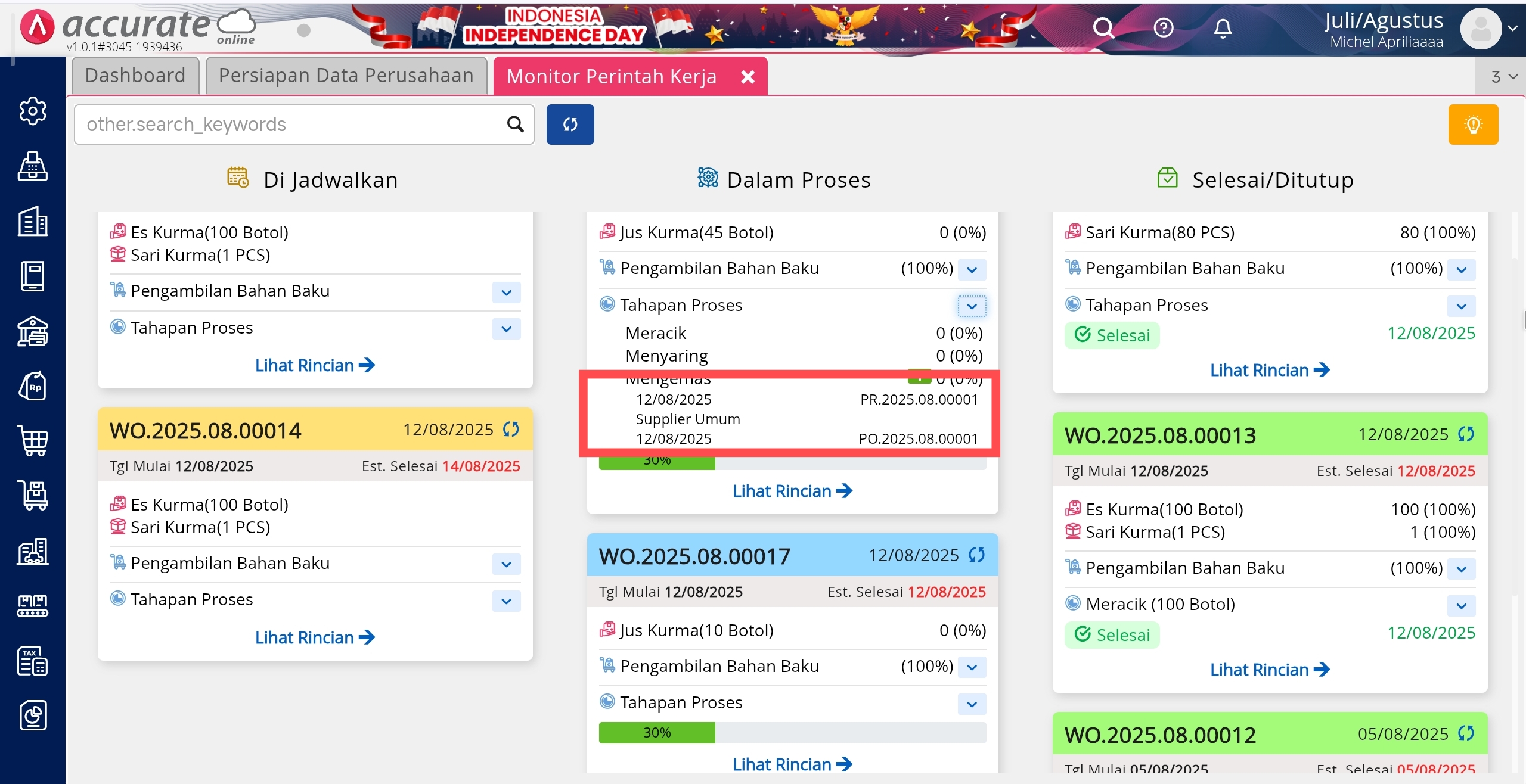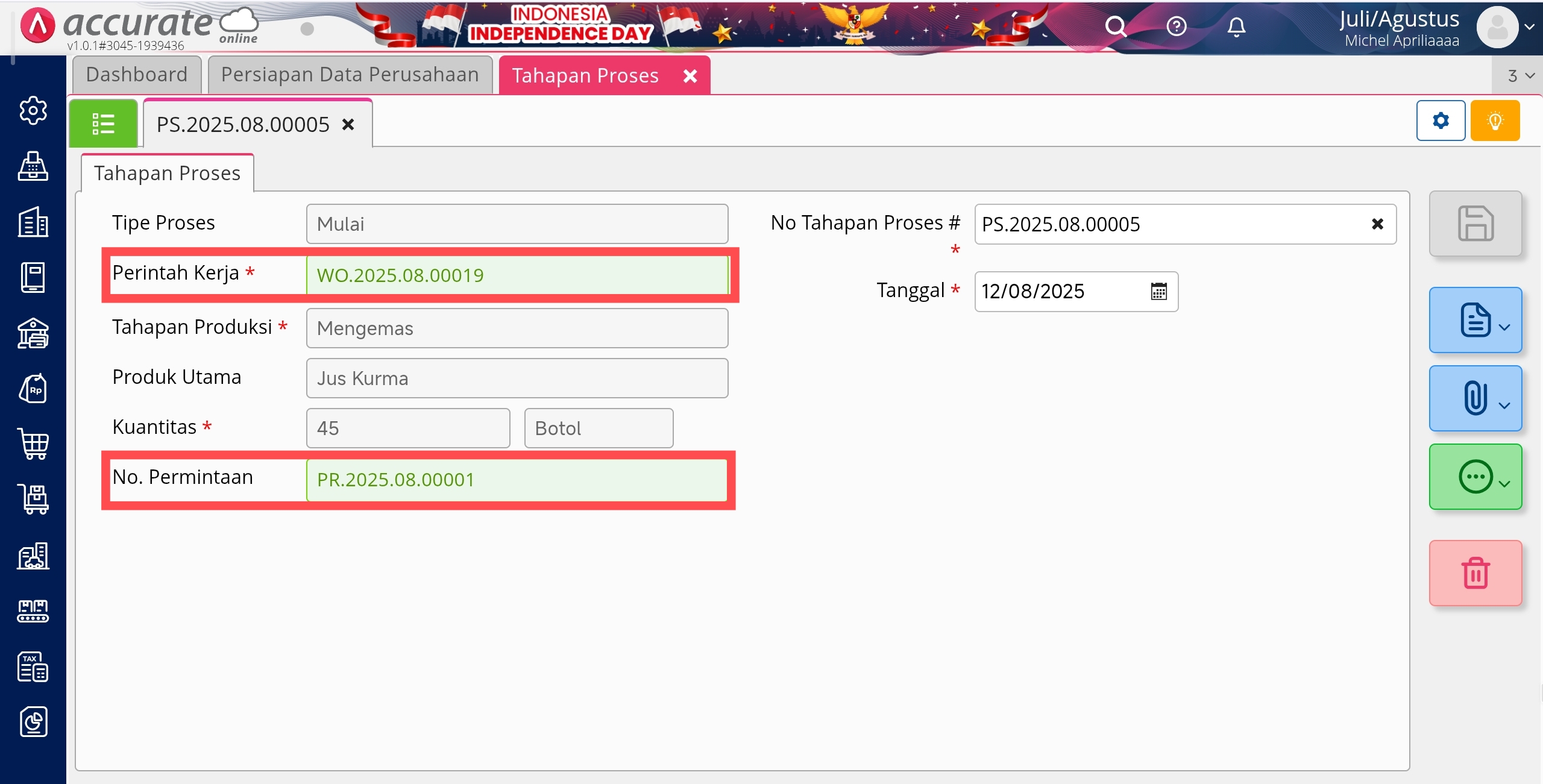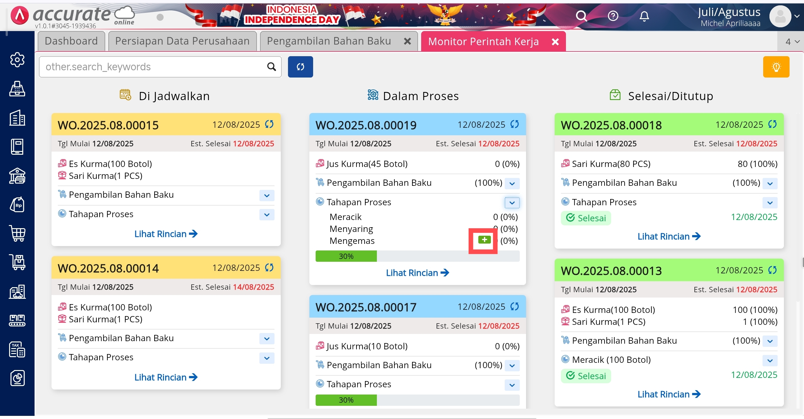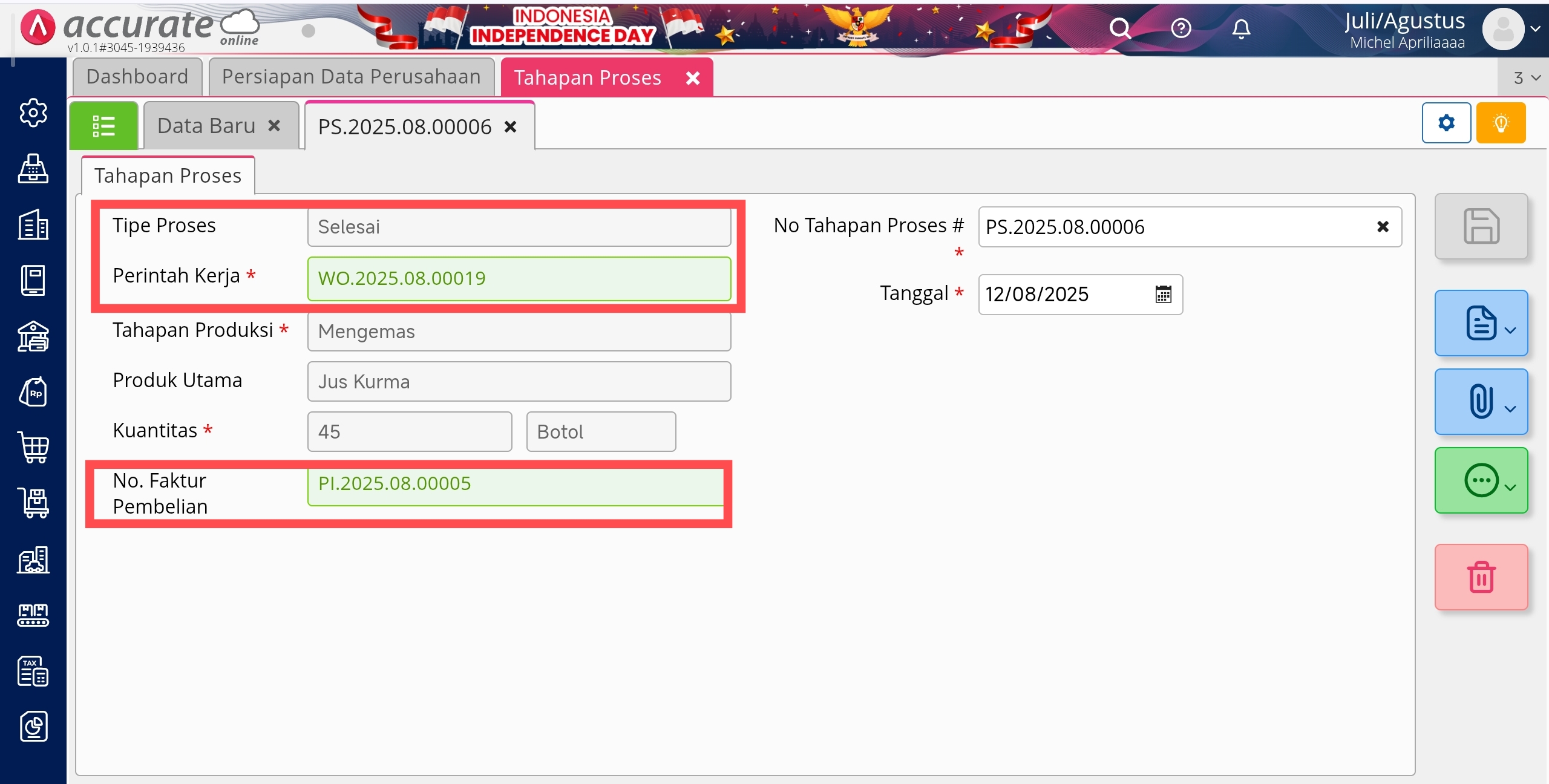 5. Selain itu Accurate Online juga akan otomatis membuatkan tahapan proses mulai atas biaya subkon tersebut saat anda membuat Permintaan Barang. Dan akan membuatkan proses Selesai Tahapan Produksi saat anda membuat transaksi Penerimaan Barang atau Faktur Pembelian atas Permintaan Barang dari Biaya Produksi yang disubkon tersebut. Anda bisa melakukan pengecekan melalui menu Manufaktur | Tahapan Proses.