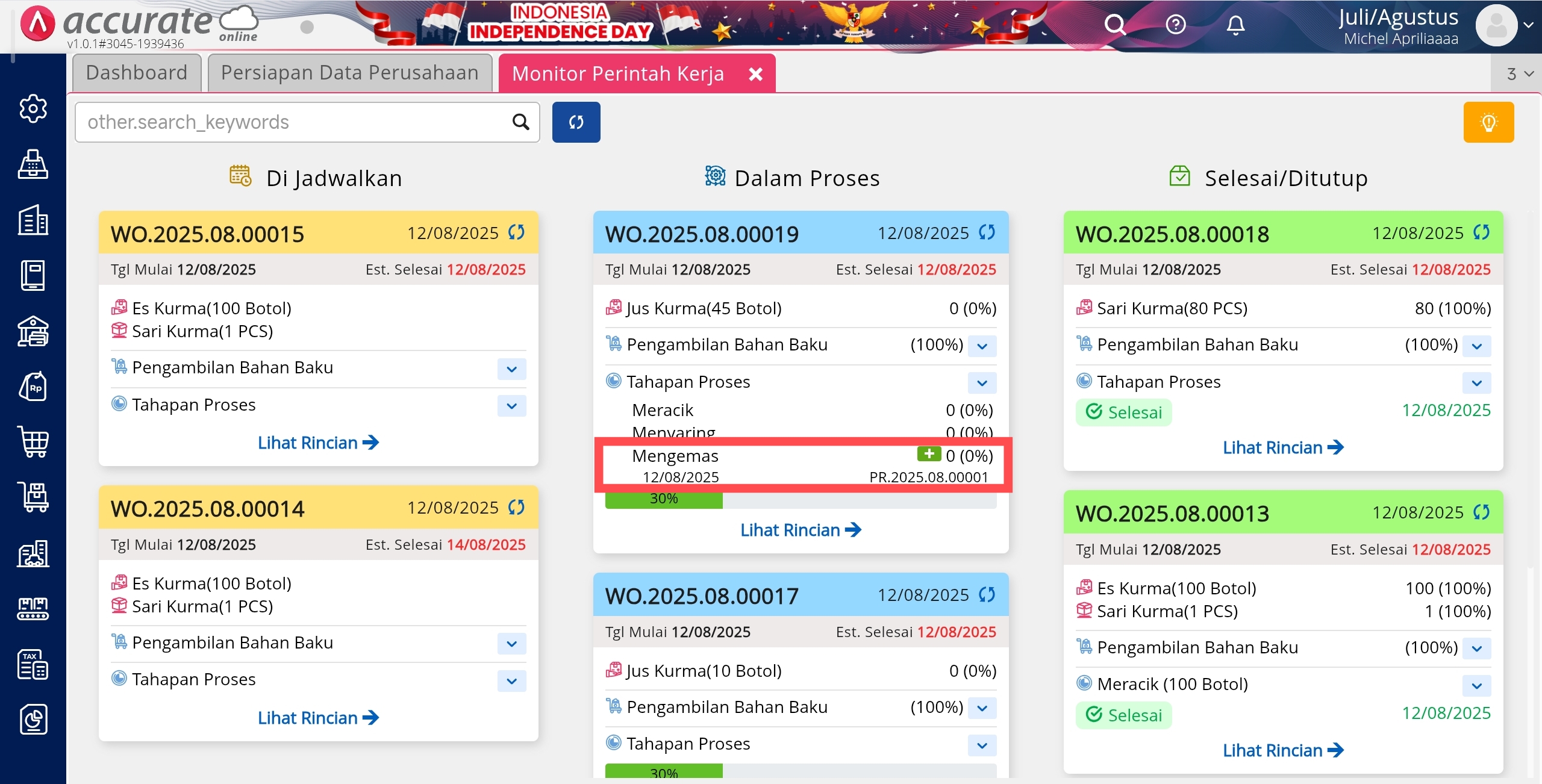 4. Simpan transaksi Permintaan barang dan pada Monitor Perintah Kerja otomatis terperbarui yaitu dengan menampilkan informasi Nomor Transaksi Permintaan Barang atas tahapan produksi tersebut di Surat Perintah Kerja-nya. Dan akan terus terperbarui jika ada proses lanjutan atas transaksi Permintaan Barang tersebut, yaitu misalnya saat dibuatkan Pesanan Pembelian atas permintaan barang tersebut, pada monitor Perintah Kerja juga akan menampilkan nomor transaksi Pesanan Pembeliannya, dst.