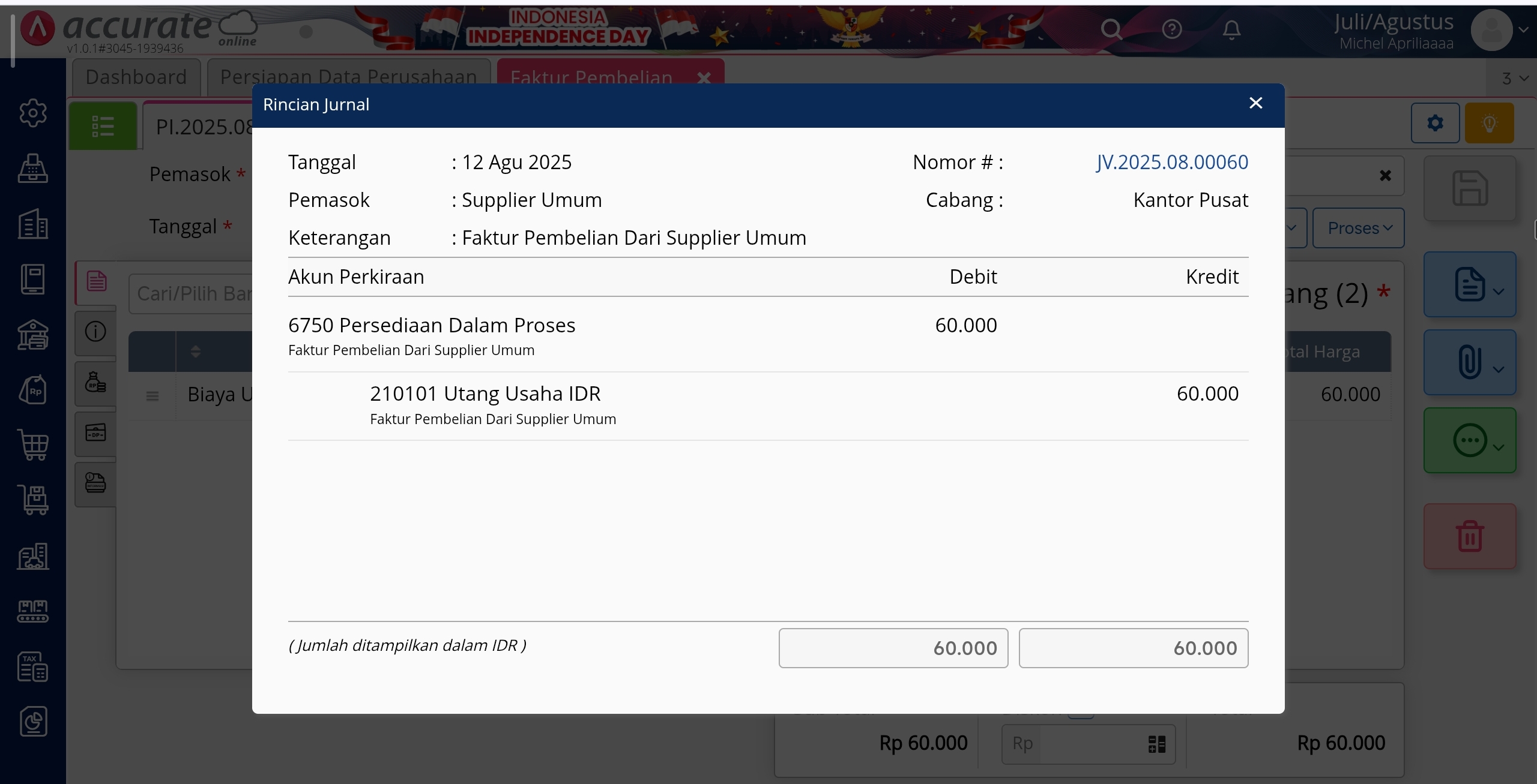 6. Dan jika Permintaan Barang atas Biaya Produksi Subkon tersebut dibuatkan transaksi Penerimaan Barang ataupun Faktur Pembelian-nya, maka jurnal yang terbentuk akan otomatis masuk ke akun Perintah Kerja. Seperti contoh berikut ini.