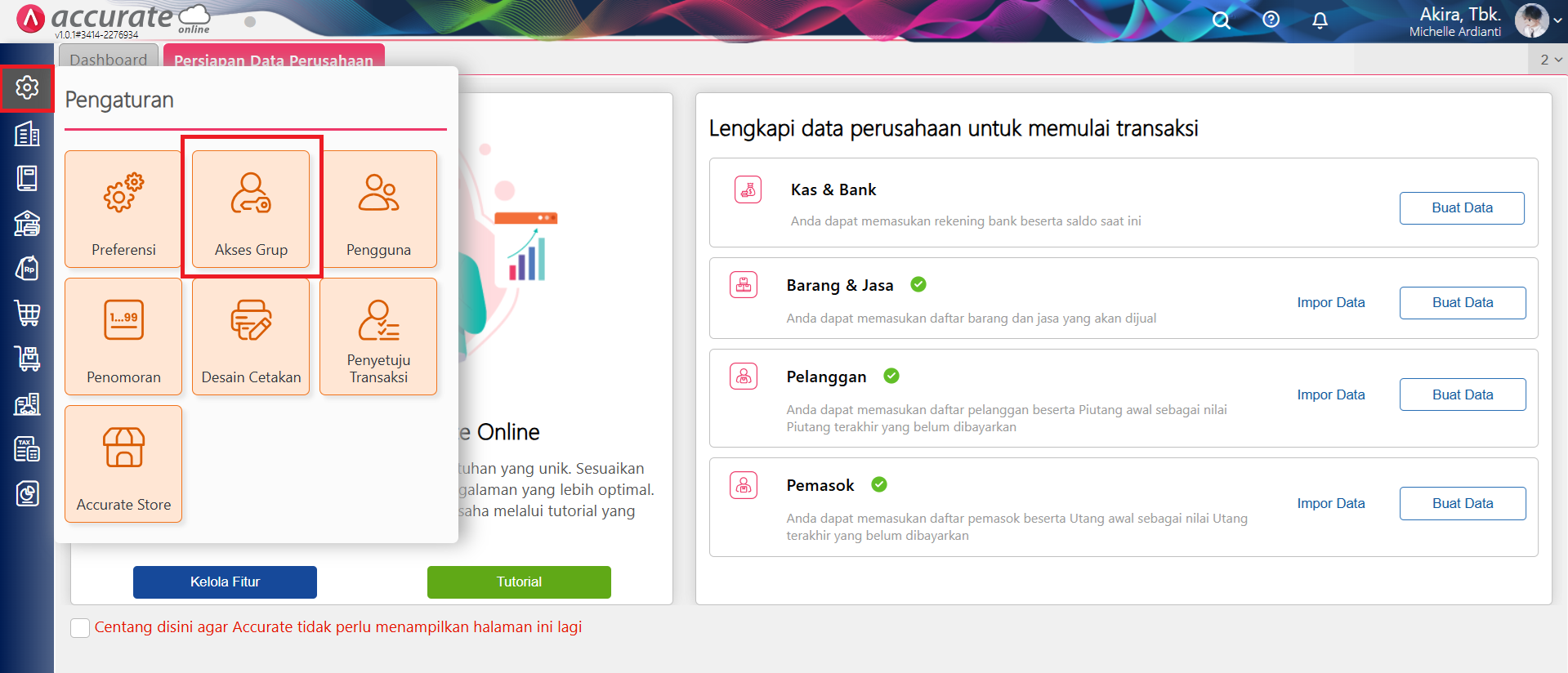 Akses Grup pada menu Pengaturan, berfungsi untuk mengelompokkan pengguna-pengguna yang memiliki kesamaan akses ke fitur-fitur data usaha Accurate Online. Anda bisa membuat Akses Grup lebih dari satu, sehingga memungkin bagi Anda untuk membuat beberapa Akses Grup sesuai dengan jenjang kewenangan di perusahaan Anda.