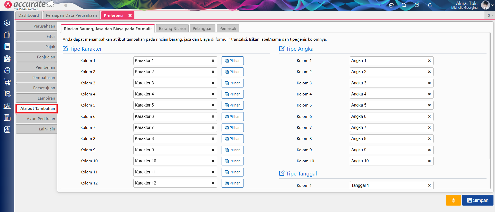 Atribut Tambahan merupakan fitur untuk memberikan keterangan tambahan pada Barang, Jasa, Biaya Lainnya di rancangan formulir transaksi serta keterangan tambahan pada data Barang & Jasa, Pelanggan dan Pemasok. Keterangan tambahan tersebut dapat berupa karakter (isian atau pilihan), berupa angka (pengisian nomor/angka) dan berupa tanggal.