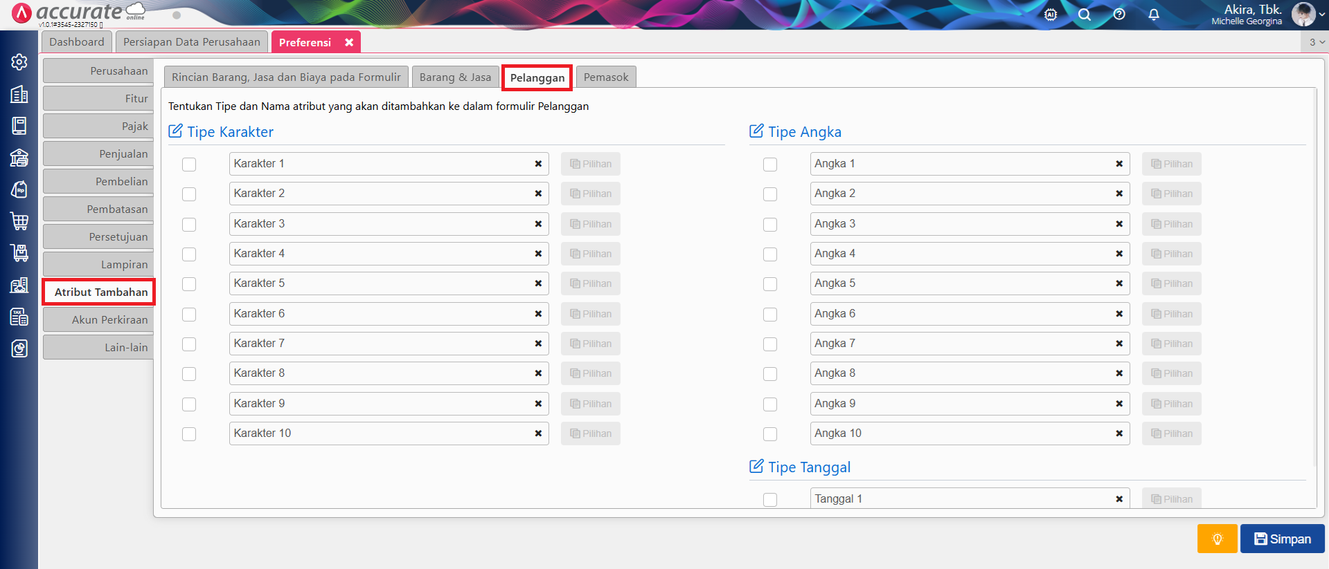 - Aktifkan Atribut Tambahan Pelanggan yang ingin digunakan pada menu Preferensi | Atribut Tambahan kemudian isikan sesuai kebutuhan.